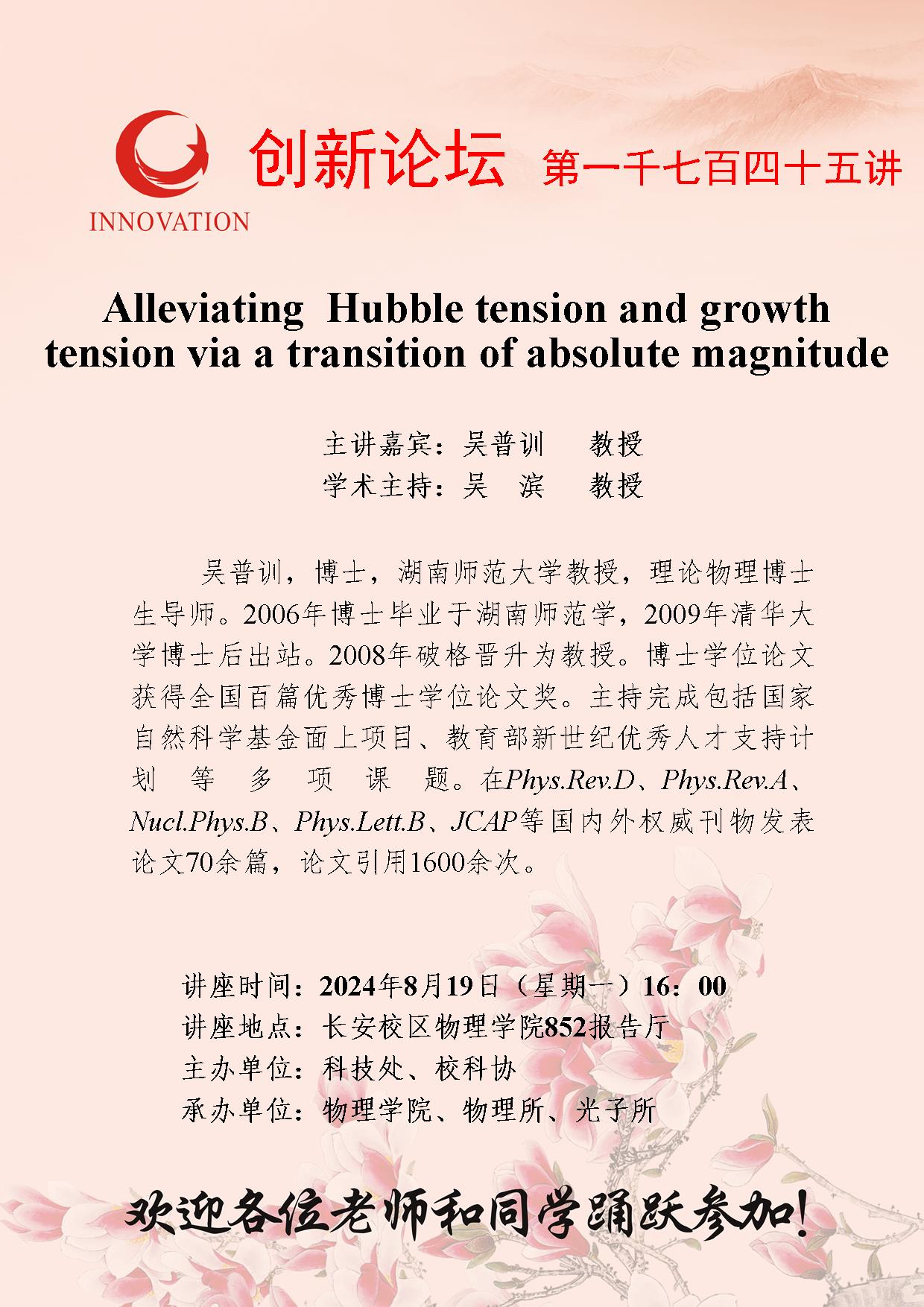 吴普训 教授 伟德国际1949始于英国创新论坛第一千七百四十五讲:Alleviating Hubble tension and growth tension via a transition of absolute magnitude 讲座时间 2024年8月19日(星期一)16:00 讲座地点 长安校区物理学院852报告厅 讲座人介绍 吴普训 教授 讲座内容
