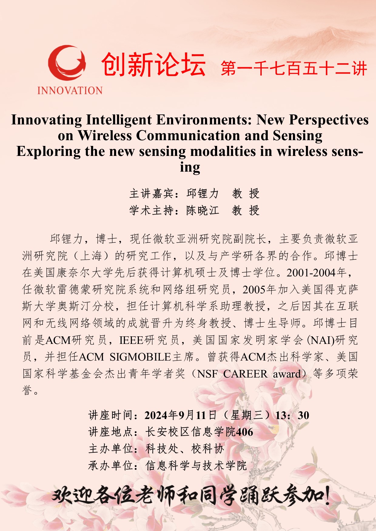 邱锂力 教授 伟德国际1949始于英国创新论坛第一千七百五十二讲:Innovating Intelligent Environments: New Perspectives on Wireless Communication and Sensing Exploring the new sensing modalities in wireless sensing 讲座时间 2024年9月11日(星期三)13:30 讲座地点 长安校区信息学院406 讲座人介绍 邱锂力 教授 讲座内容
