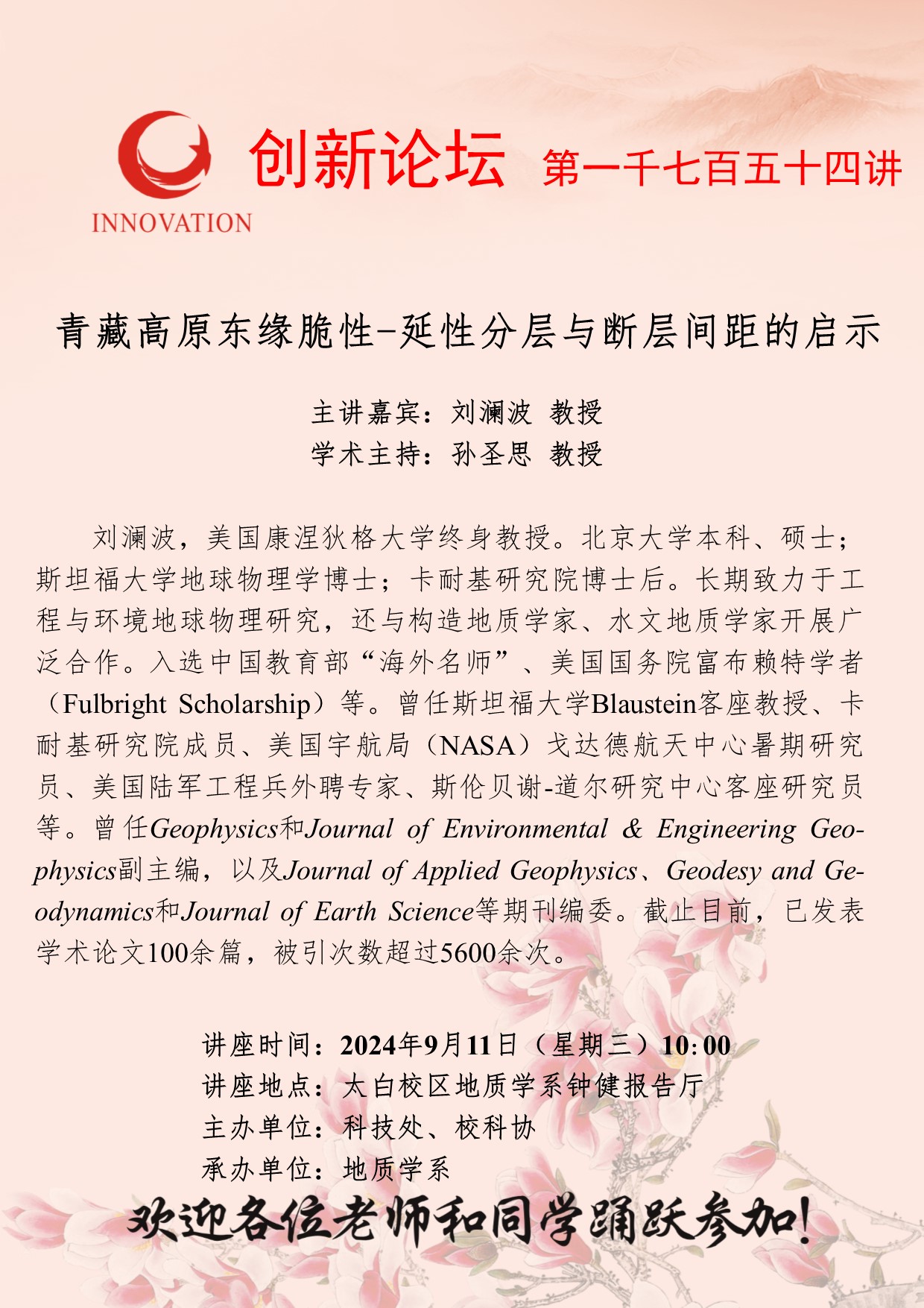 刘澜波 教授 伟德国际1949始于英国创新论坛第一千七百五十四讲:青藏高原东缘脆性-延性分层与断层间距的启示 讲座时间 2024年9月11日(星期三)10:00 讲座地点 太白校区地质学系钟健报告厅 讲座人介绍 刘澜波 教授 讲座内容