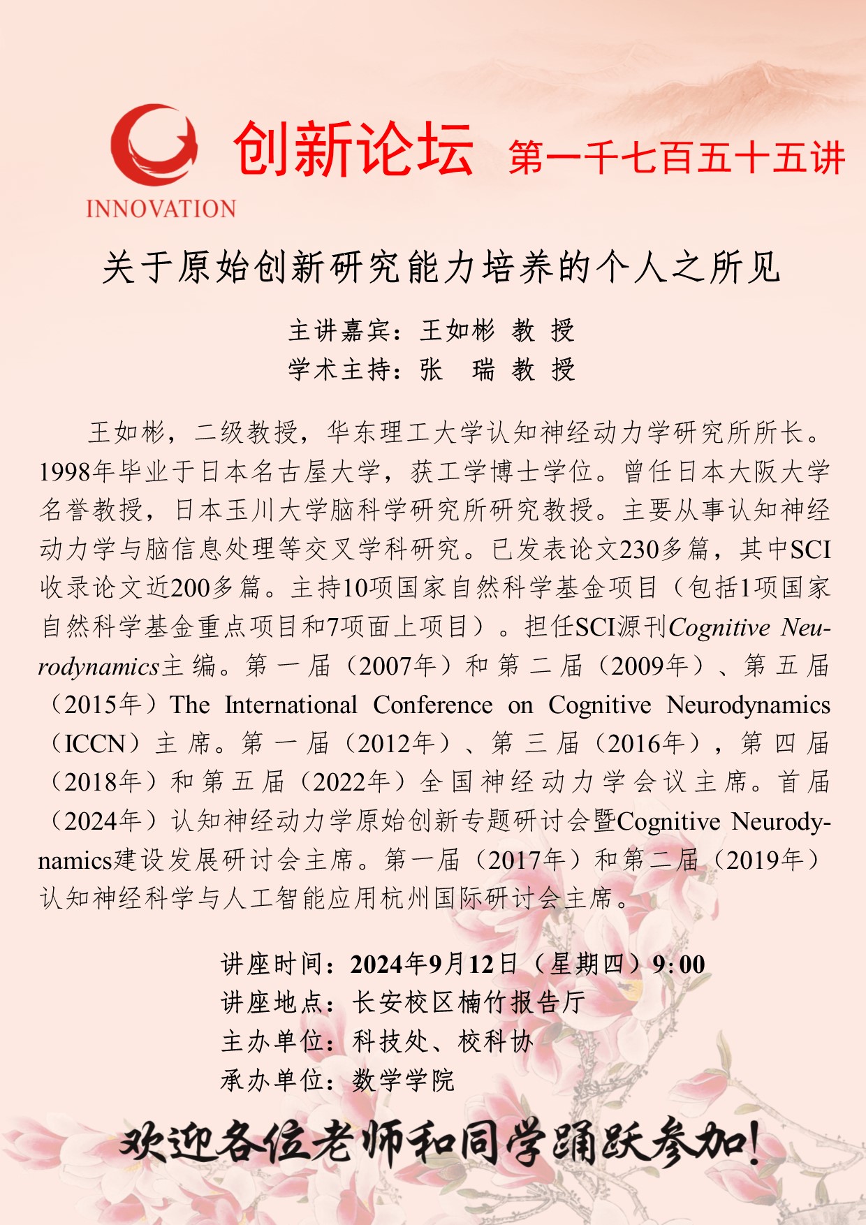 王如彬 教授 伟德国际1949始于英国创新论坛第一千七百五十五讲:关于原始创新研究能力培养的个人之所见 讲座时间 2024年9月12日(星期四)9:00 讲座地点 长安校区楠竹报告厅 讲座人介绍 王如彬 教授 讲座内容