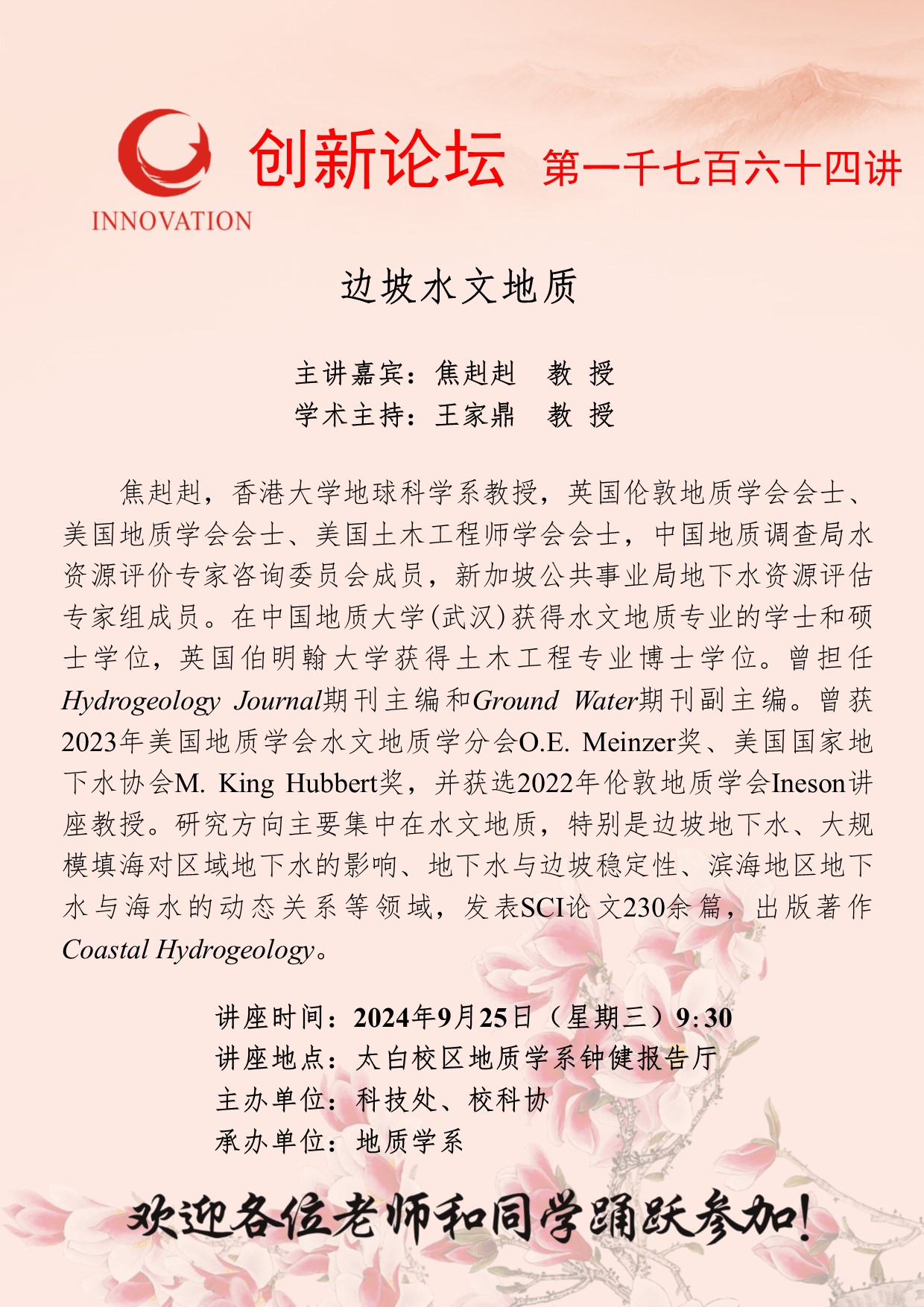 焦赳赳 教授 伟德国际1949始于英国创新论坛第一千七百六十四讲:边坡水文地质 讲座时间 2024年9月25日(星期三)9:30 讲座地点 太白校区地质学系钟健报告厅 讲座人介绍 焦赳赳 教授 讲座内容