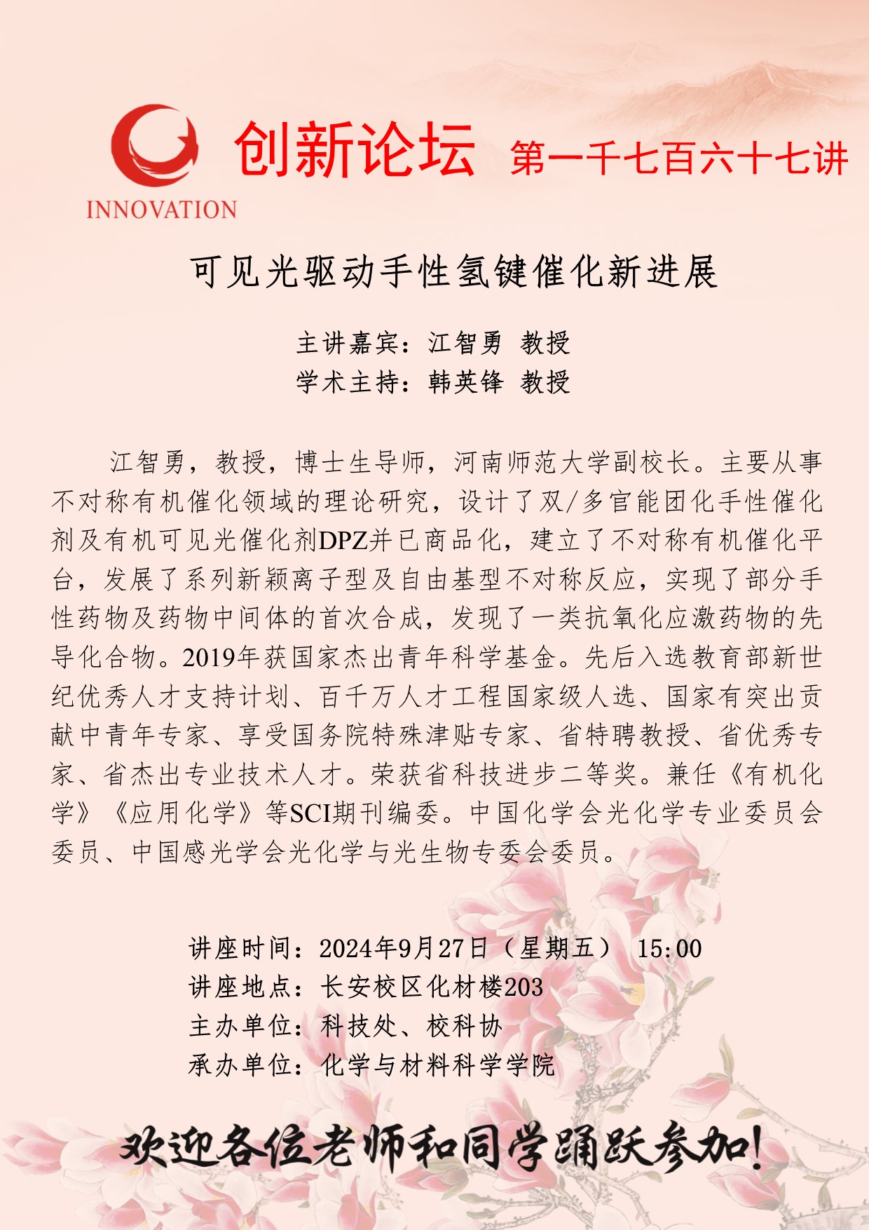江智勇 教授 伟德国际1949始于英国创新论坛第一千七百六十七讲:可见光驱动手性氢键催化新进展 讲座时间 2024年9月27日(星期五) 15:00 讲座地点 长安校区化材楼203 讲座人介绍 江智勇 教授 讲座内容