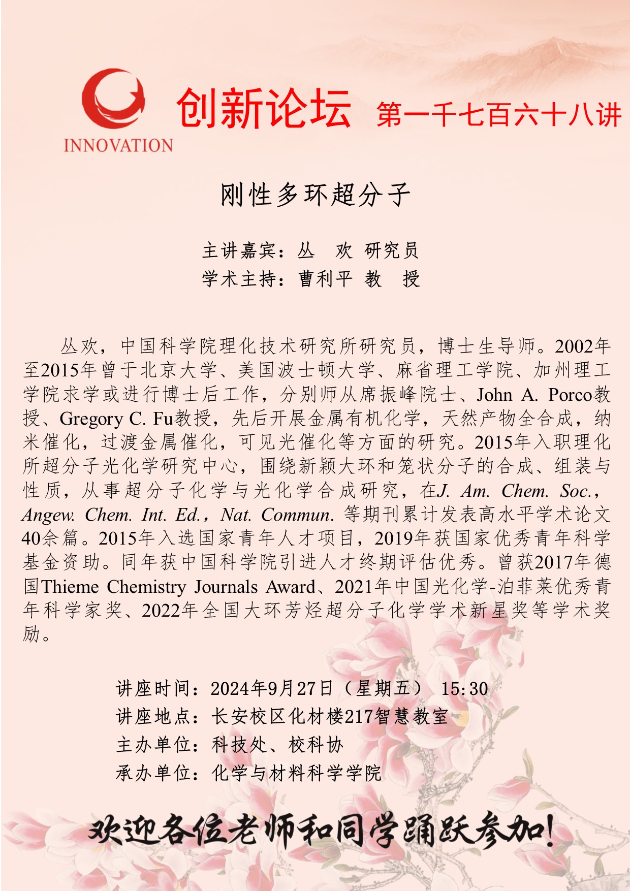 丛欢 研究员 伟德国际1949始于英国创新论坛第一千七百六十八讲:刚性多环超分子 讲座时间 2024年9月27日(星期五) 15:30 讲座地点 长安校区化材楼217智慧教室 讲座人介绍 丛欢 研究员 讲座内容