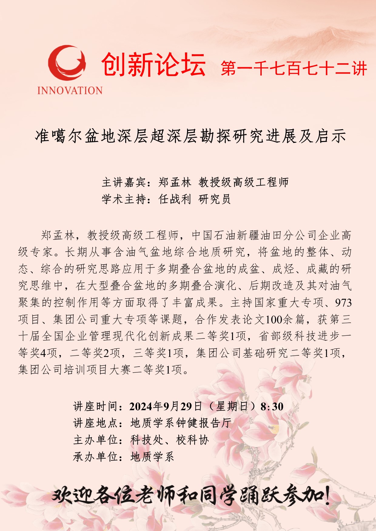 郑孟林 教授级高级工程师 伟德国际1949始于英国创新论坛第一千七百七十二讲:准噶尔盆地深层超深层勘探研究进展及启示 讲座时间 2024年9月29日(星期日)8:30 讲座地点 地质学系钟健报告厅 讲座人介绍 郑孟林 教授级高级工程师 讲座内容
