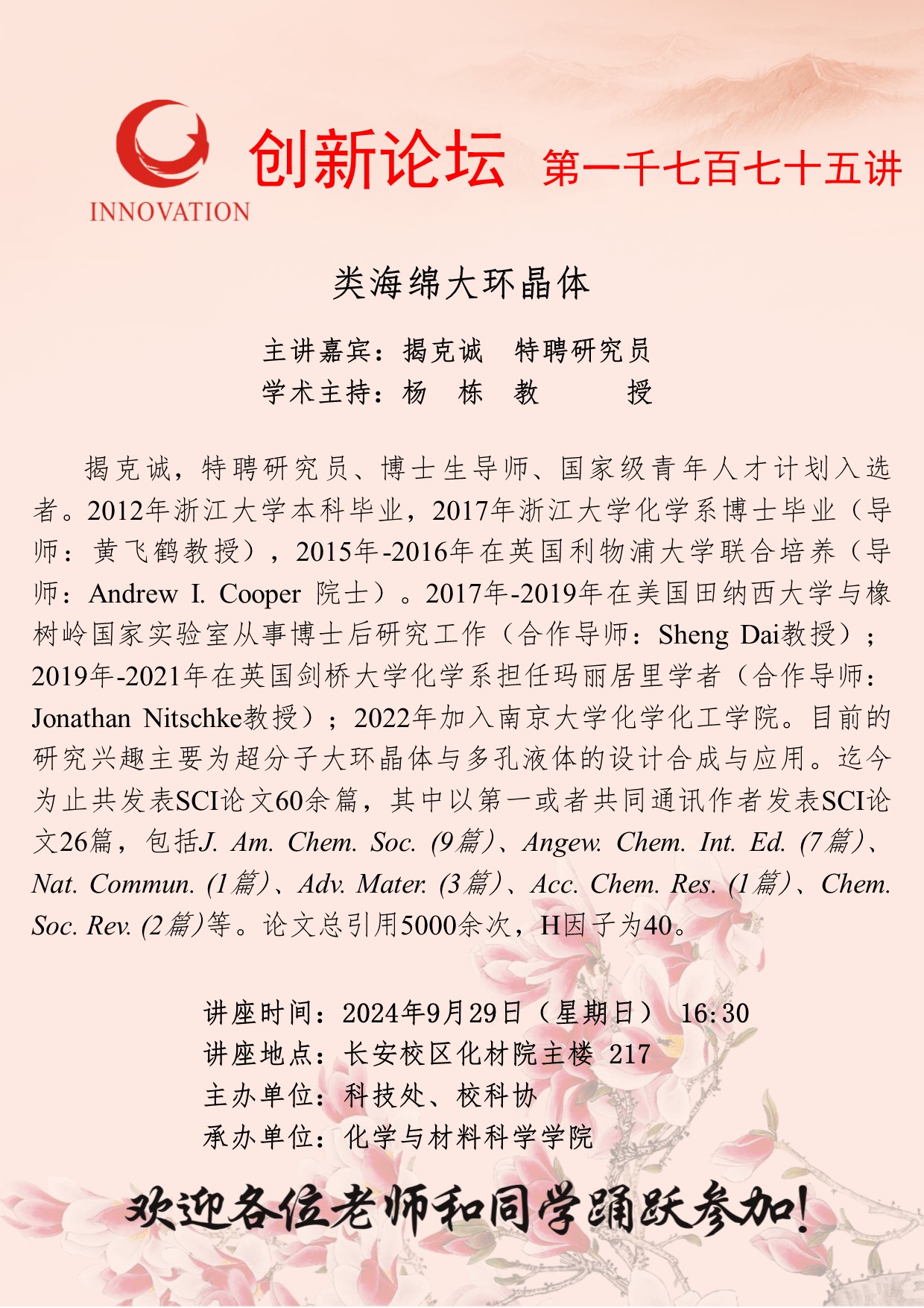 揭克诚 特聘研究员 伟德国际1949始于英国创新论坛第一千七百七十五讲:类海绵大环晶体 讲座时间 2024年9月29日(星期日) 16:30 讲座地点 长安校区化材院主楼 217 讲座人介绍 揭克诚 特聘研究员 讲座内容