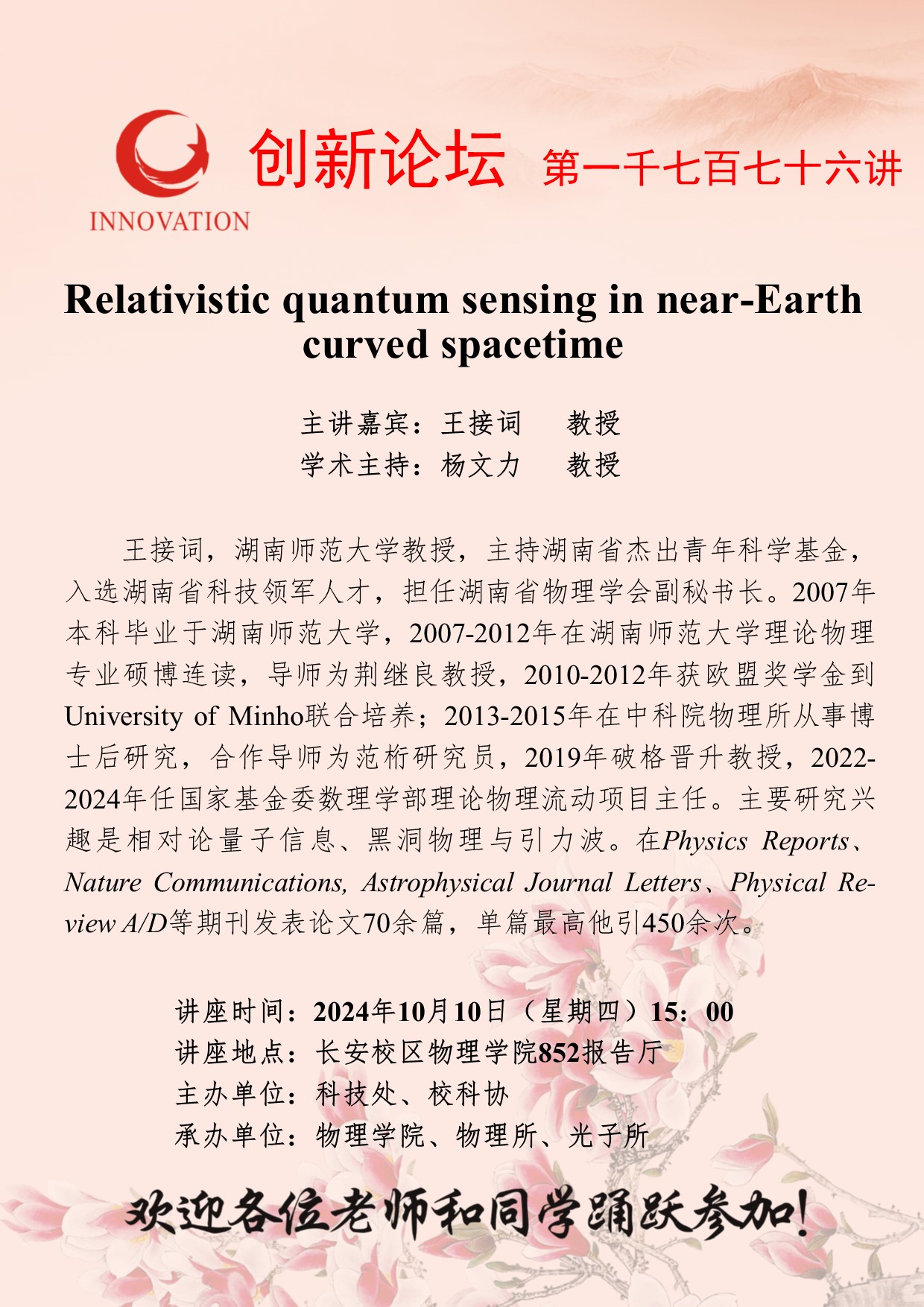 王接词 教授 伟德国际1949始于英国创新论坛第一千七百七十六讲:Relativistic quantum sensing in near-Earth curved spacetime 讲座时间 2024年10月10日(星期四)15:00 讲座地点 长安校区物理学院852报告厅 讲座人介绍 王接词 教授 讲座内容