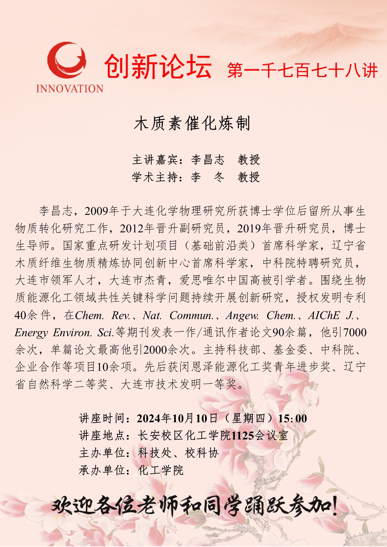 李昌志 教授 伟德国际1949始于英国创新论坛第一千七百七十八讲:木质素催化炼制 讲座时间 2024年10月10日(星期四)15:00 讲座地点 长安校区化工学院1125会议室 讲座人介绍 李昌志 教授 讲座内容
