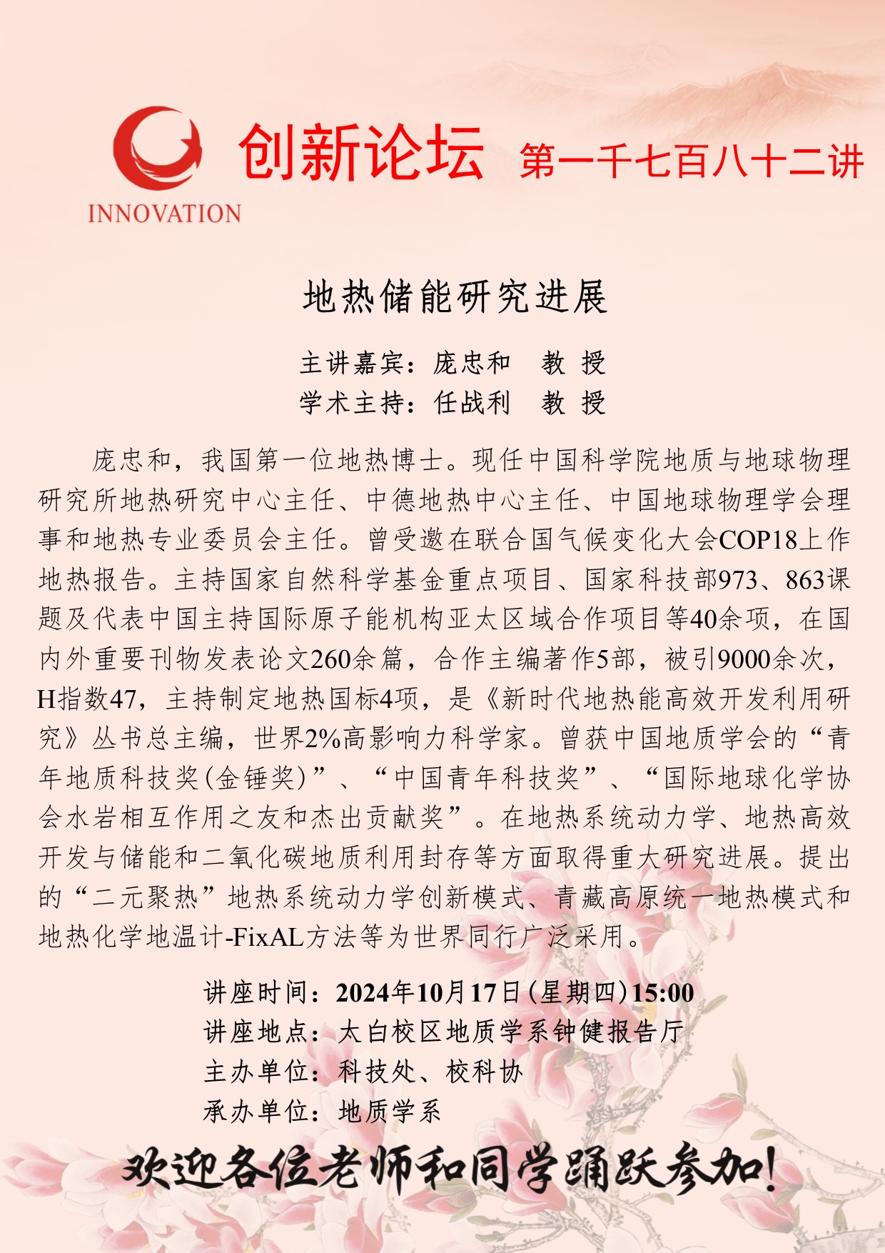 庞忠和 教授 伟德国际1949始于英国创新论坛第一千七百八十二讲:地热储能研究进展 讲座时间 2024年10月17日(星期四)15:00 讲座地点 太白校区地质学系钟健报告厅 讲座人介绍 庞忠和 教授 讲座内容