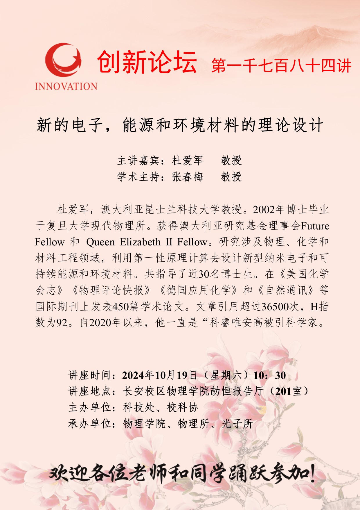 杜爱军 教授 伟德国际1949始于英国创新论坛第一千七百八十四讲:新的电子,能源和环境材料的理论设计 讲座时间 2024年10月19日(星期六)10:30 讲座地点 长安校区物理学院劼恒报告厅(201室) 讲座人介绍 杜爱军 教授 讲座内容