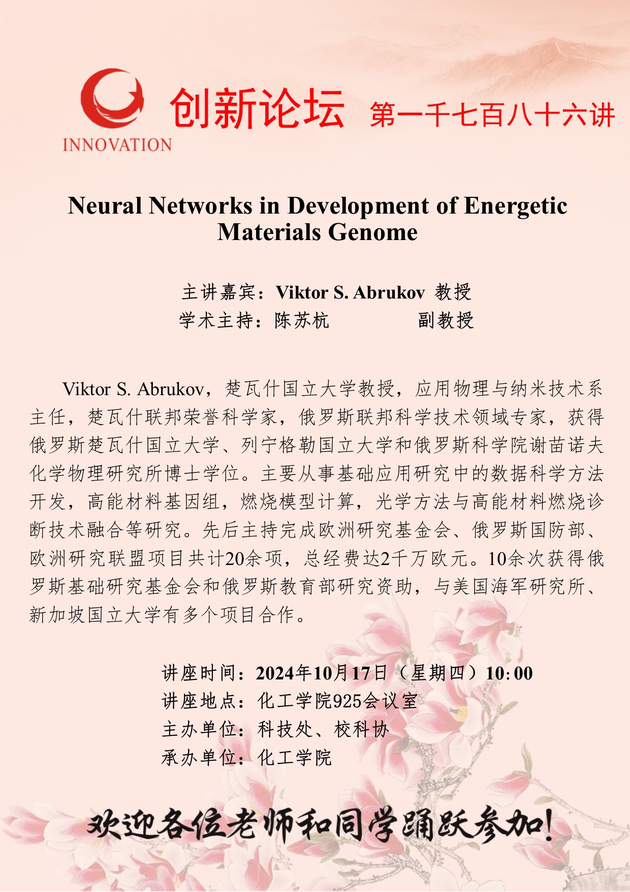 Viktor S. Abrukov 教授 伟德国际1949始于英国创新论坛第一千七百八十六讲:Neural Networks in Development of Energetic Materials Genome 讲座时间 2024年10月17日(星期四)10:00 讲座地点 化工学院925会议室 讲座人介绍 Viktor S. Abrukov 教授 讲座内容