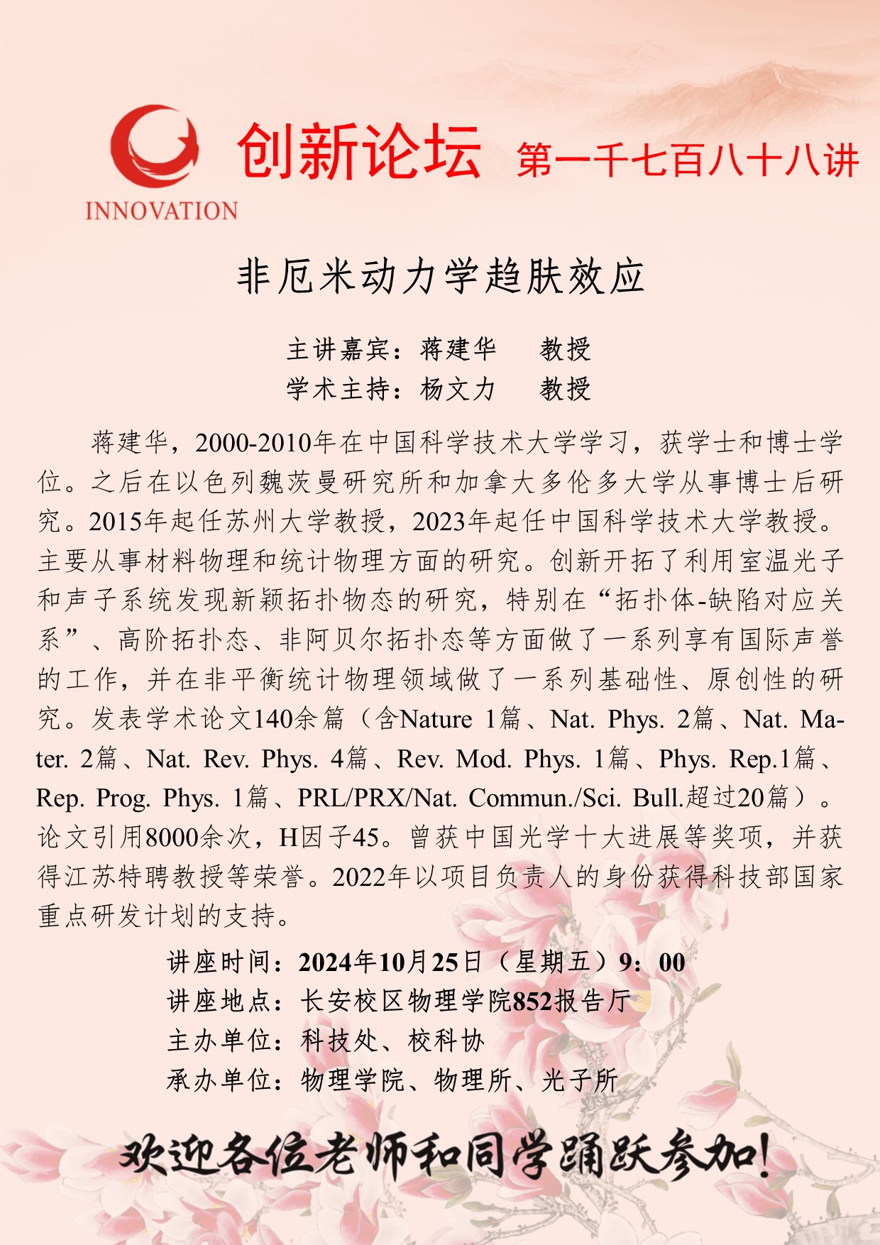 蒋建华 教授 伟德国际1949始于英国创新论坛第一千七百八十八讲:非厄米动力学趋肤效应 讲座时间 2024年10月25日(星期五)9:00 讲座地点 长安校区物理学院852报告厅 讲座人介绍 蒋建华 教授 讲座内容