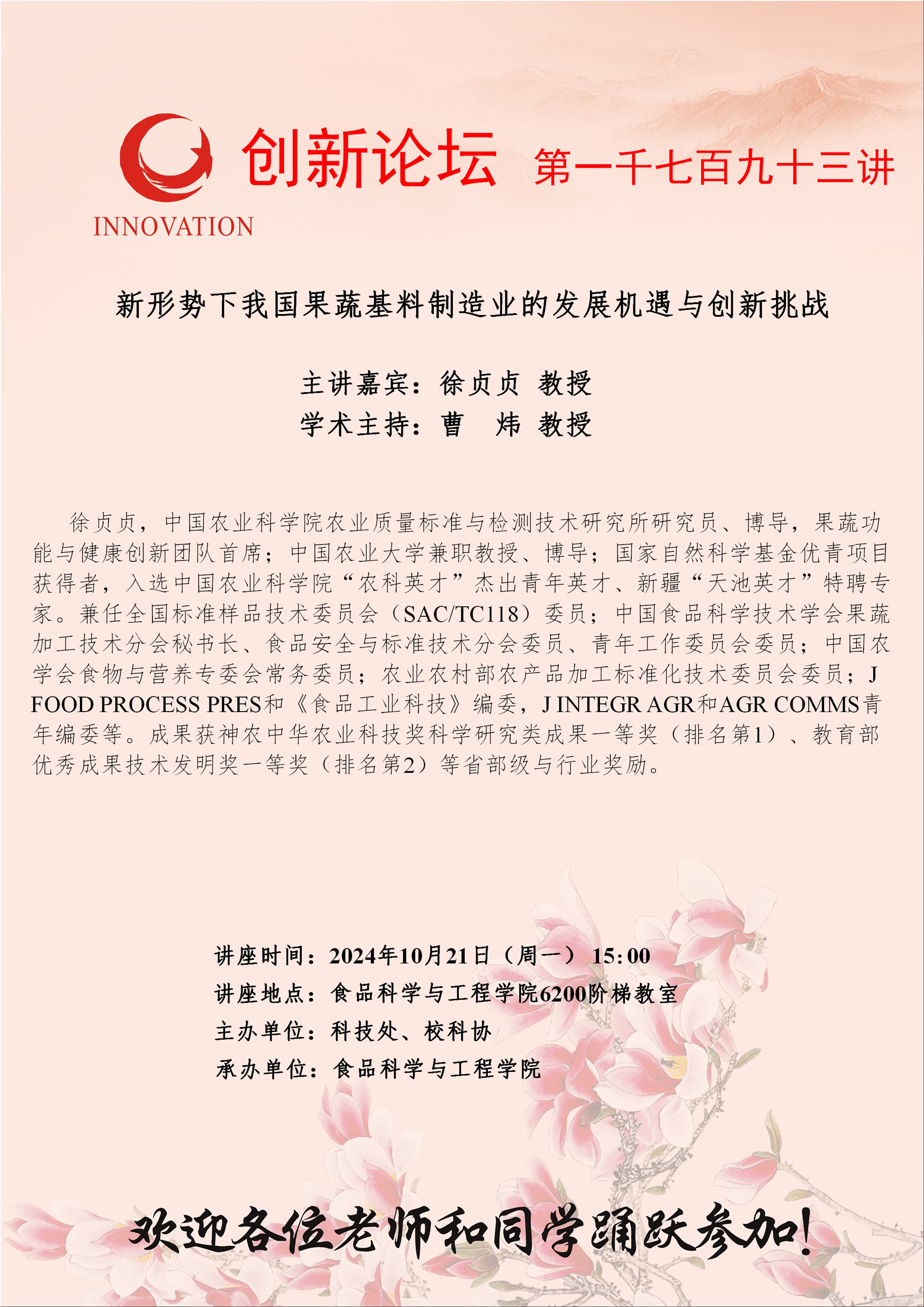徐贞贞 教授 伟德国际1949始于英国创新论坛第一千七百九十三讲: 新形势下我国果蔬基料制造业的发展机遇与创新挑战 讲座时间 2024年10月21日(星期一)15:00 讲座地点 太白校区食品科学与工程学院6200阶梯教室 讲座人介绍 徐贞贞 教授 讲座内容