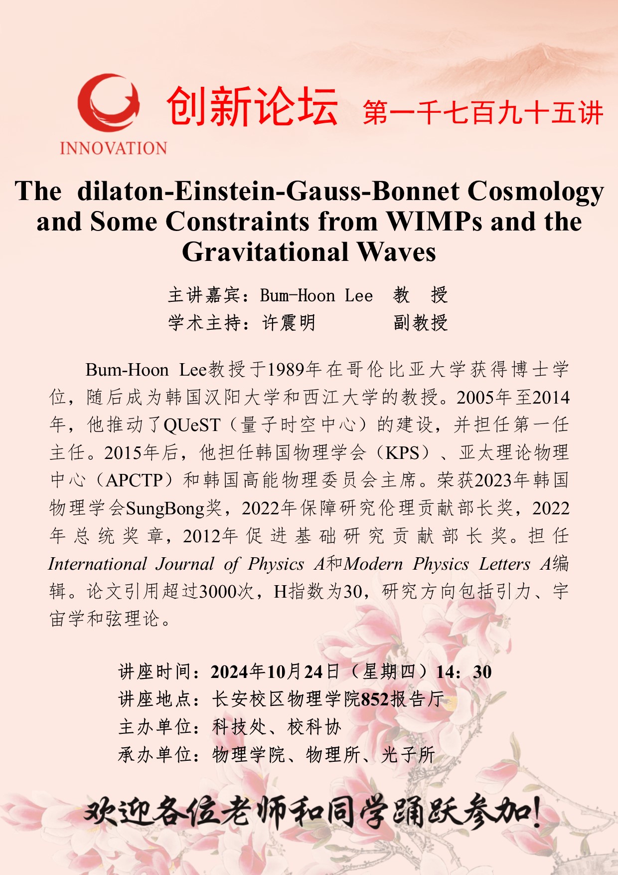 Bum-Hoon Lee 教授 伟德国际1949始于英国创新论坛第一千七百九十五讲:The dilaton-Einstein-Gauss-Bonnet Cosmology and Some Constraints from WIMPs and the Gravitational Waves 讲座时间 2024年10月24日(星期四)14:30 讲座地点 长安校区物理学院852报告厅 讲座人介绍 Bum-Hoon Lee 教授 讲座内容