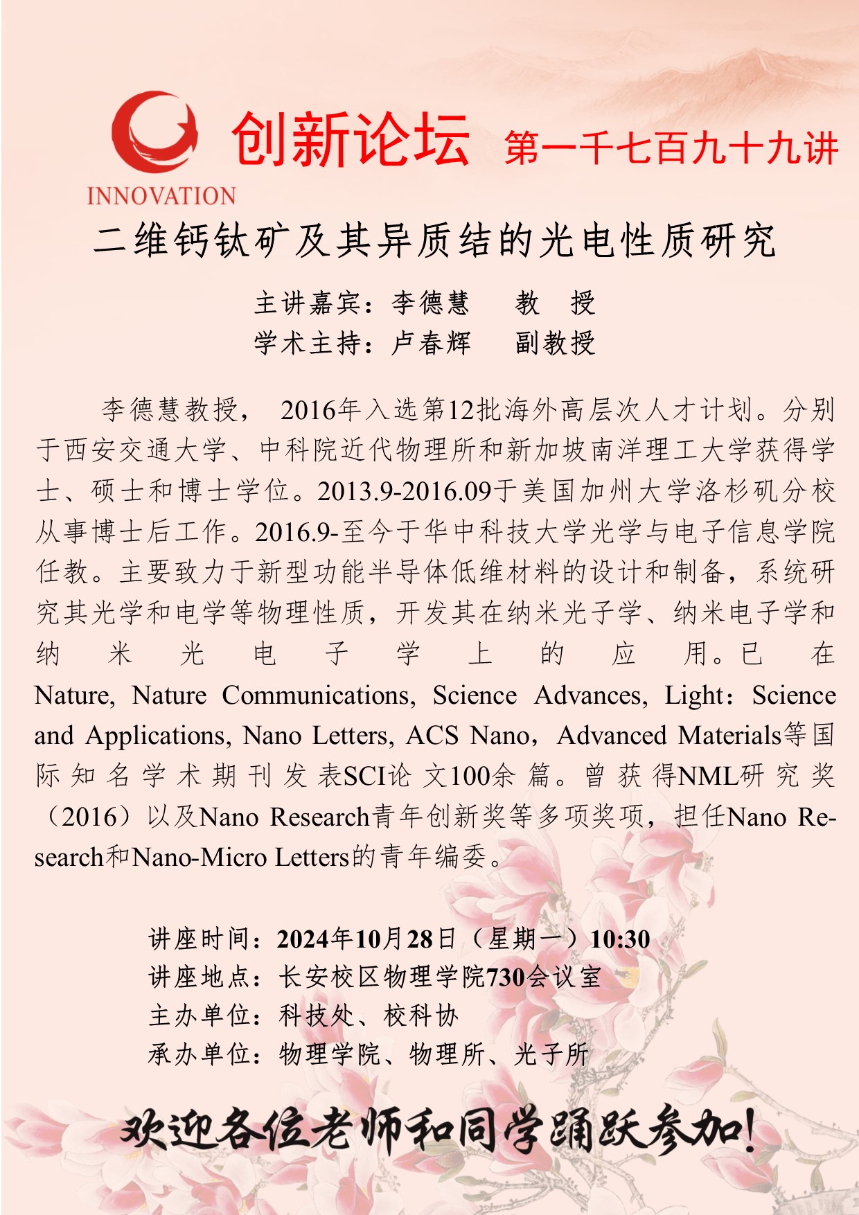 李德慧 教授 伟德国际1949始于英国创新论坛第一千七百九十九讲:二维钙钛矿及其异质结的光电性质研究 讲座时间 2024年10月28日(星期一)10:30 讲座地点 长安区物理学院730会议室 讲座人介绍 李德慧 教授 讲座内容