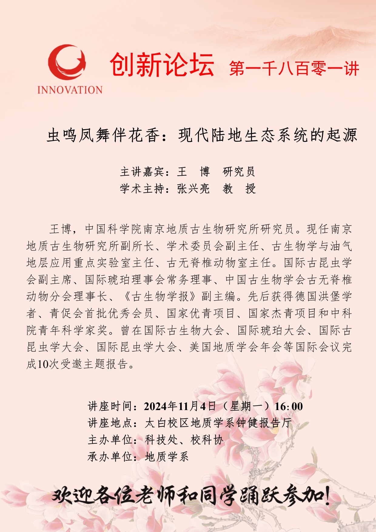 王 博 研究员 伟德国际1949始于英国创新论坛第一千八百零一讲:虫鸣凤舞伴花香:现代陆地生态系统的起源 讲座时间 2024年11月4日(星期一)16:00 讲座地点 太白校区地质学系钟健报告厅 讲座人介绍 王 博 研究员 讲座内容