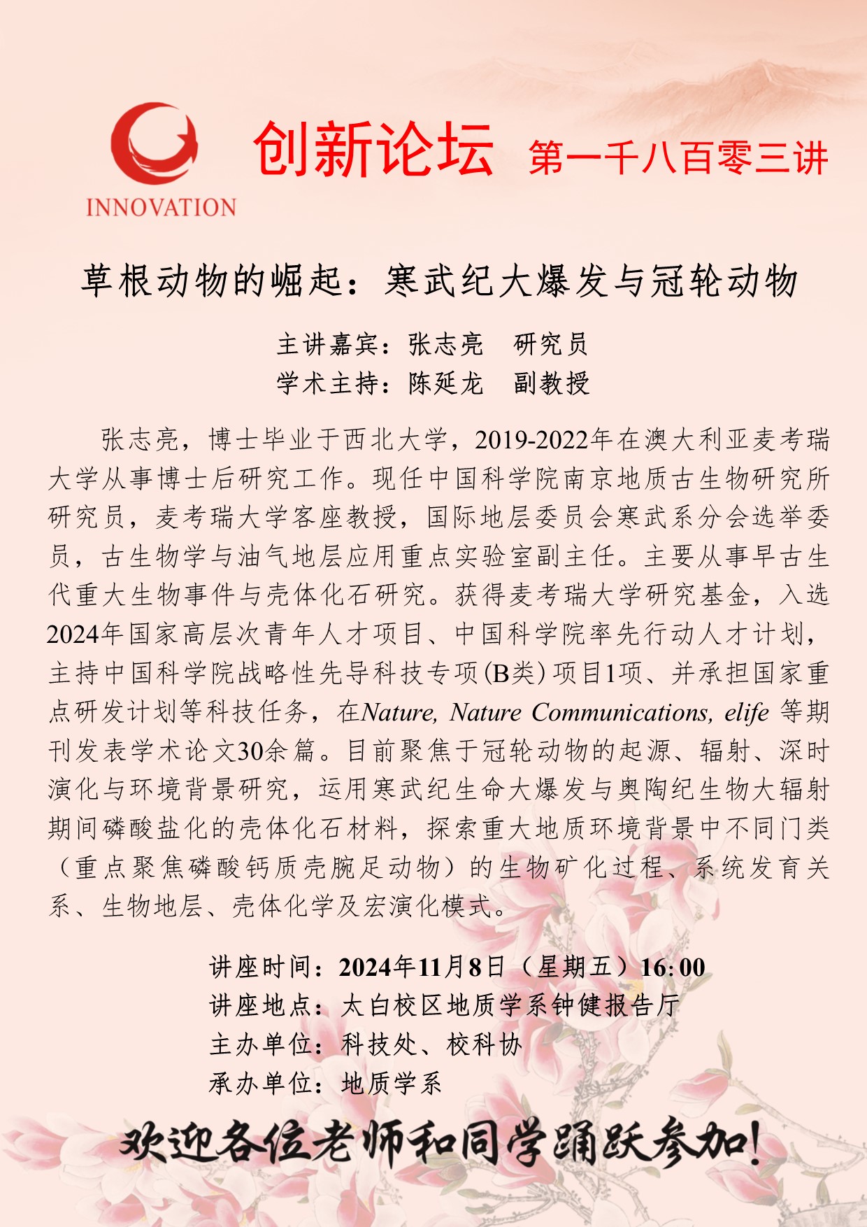 张志亮 研究员 伟德国际1949始于英国创新论坛第一千八百零三讲:草根动物的崛起:寒武纪大爆发与冠轮动物 讲座时间 2024年11月8日(星期五)16:00 讲座地点 太白校区地质学系钟健报告厅 讲座人介绍 张志亮 研究员 讲座内容