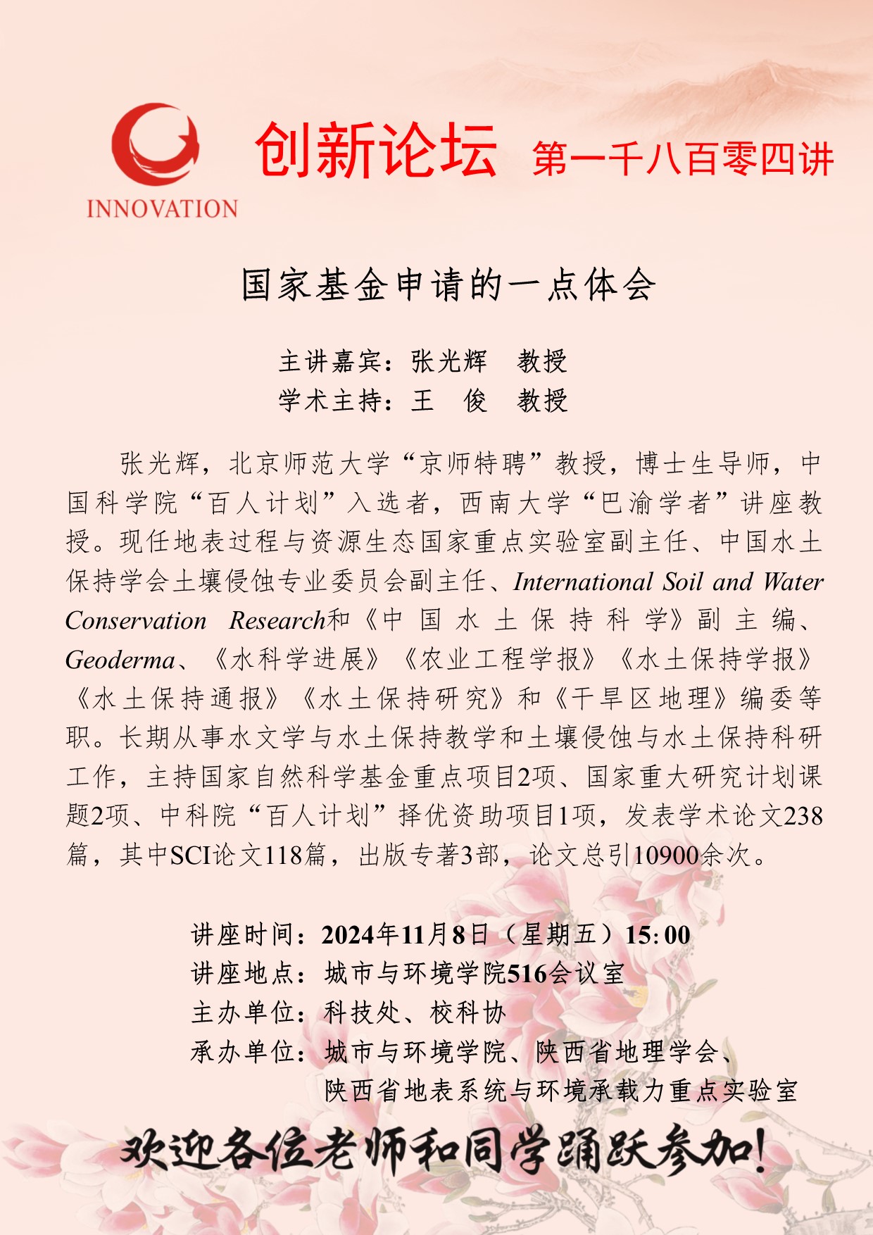 张光辉 教授 伟德国际1949始于英国创新论坛第一千八百零四讲:国家基金申请的一点体会 讲座时间 2024年11月8日(星期五)15:00 讲座地点 城市与环境学院516会议室 讲座人介绍 张光辉 教授 讲座内容