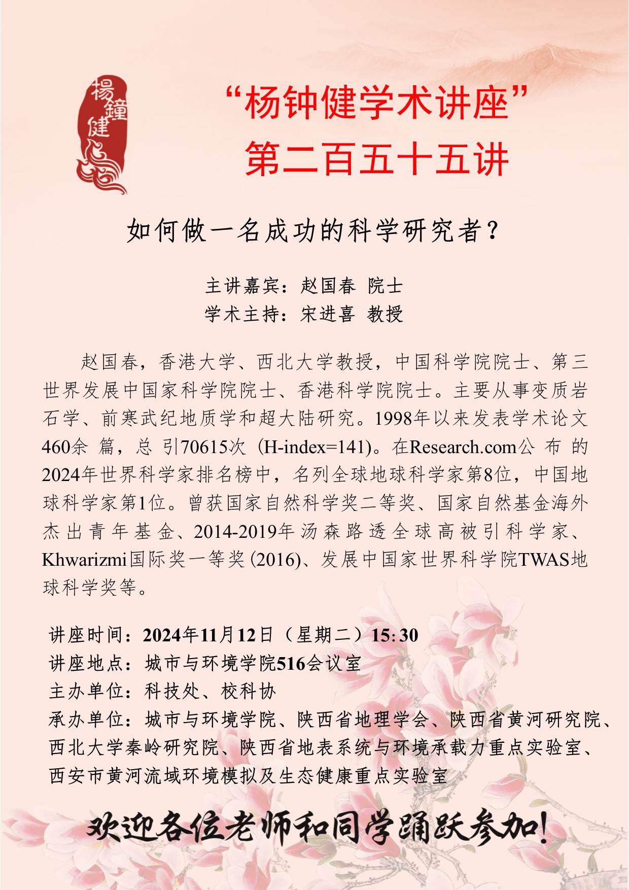 赵国春 院士 “杨钟健学术讲座”第二百五十五讲:如何做一名成功的科学研究者? 讲座时间 2024年11月12日(星期二)15:30 讲座地点 城市与环境学院516会议室 讲座人介绍 赵国春 院士 讲座内容