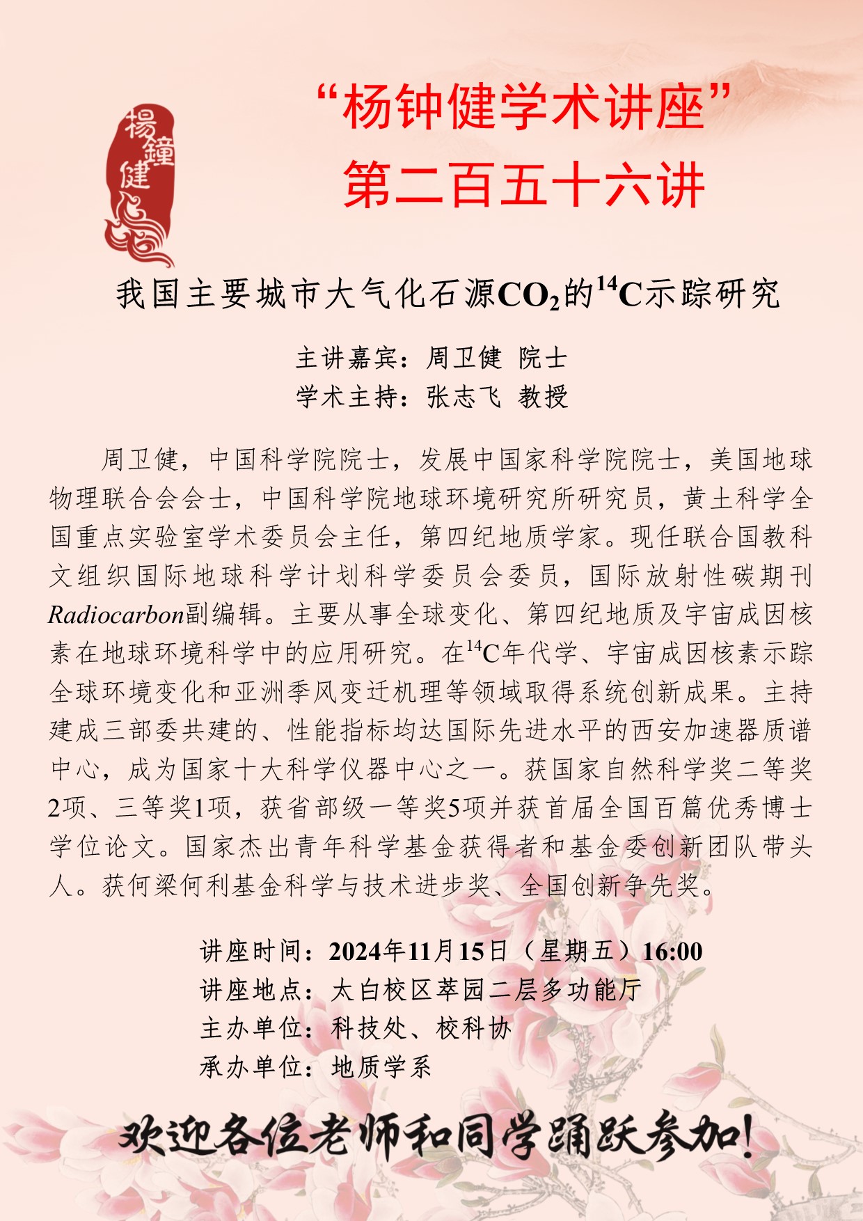 周卫健 院士 “杨钟健学术讲座”第二百五十六讲:我国主要城市大气化石源CO2的14C示踪研究 讲座时间 2024年11月15日(星期五)16:00 讲座地点 太白校区萃园二层多功能厅 讲座人介绍 周卫健 院士 讲座内容