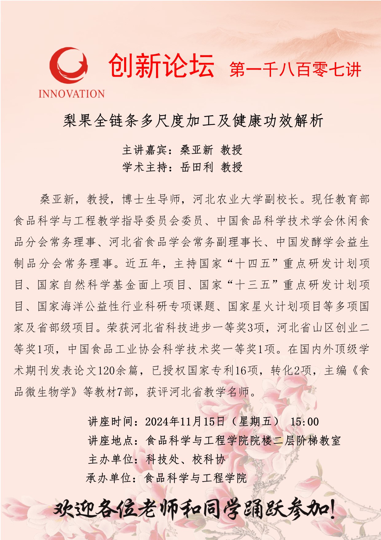 桑亚新 教授 伟德国际1949始于英国创新论坛第一千八百零七讲: 梨果全链条多尺度加工及健康功效解析 讲座时间 2024年11月15日(星期五) 15:00 讲座地点 食品科学与工程学院院楼二层阶梯教室 讲座人介绍 桑亚新 教授 讲座内容