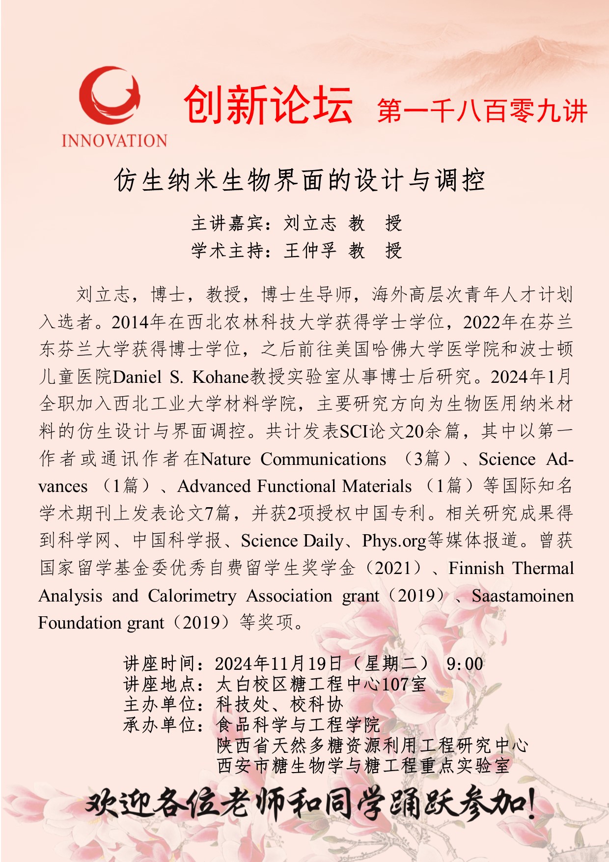 刘立志 教授 伟德国际1949始于英国创新论坛第一千八百零九讲:仿生纳米生物界面的设计与调控 讲座时间 2024年11月19日(星期二) 9:00 讲座地点 太白校区糖工程中心107室 讲座人介绍 刘立志 教授 讲座内容