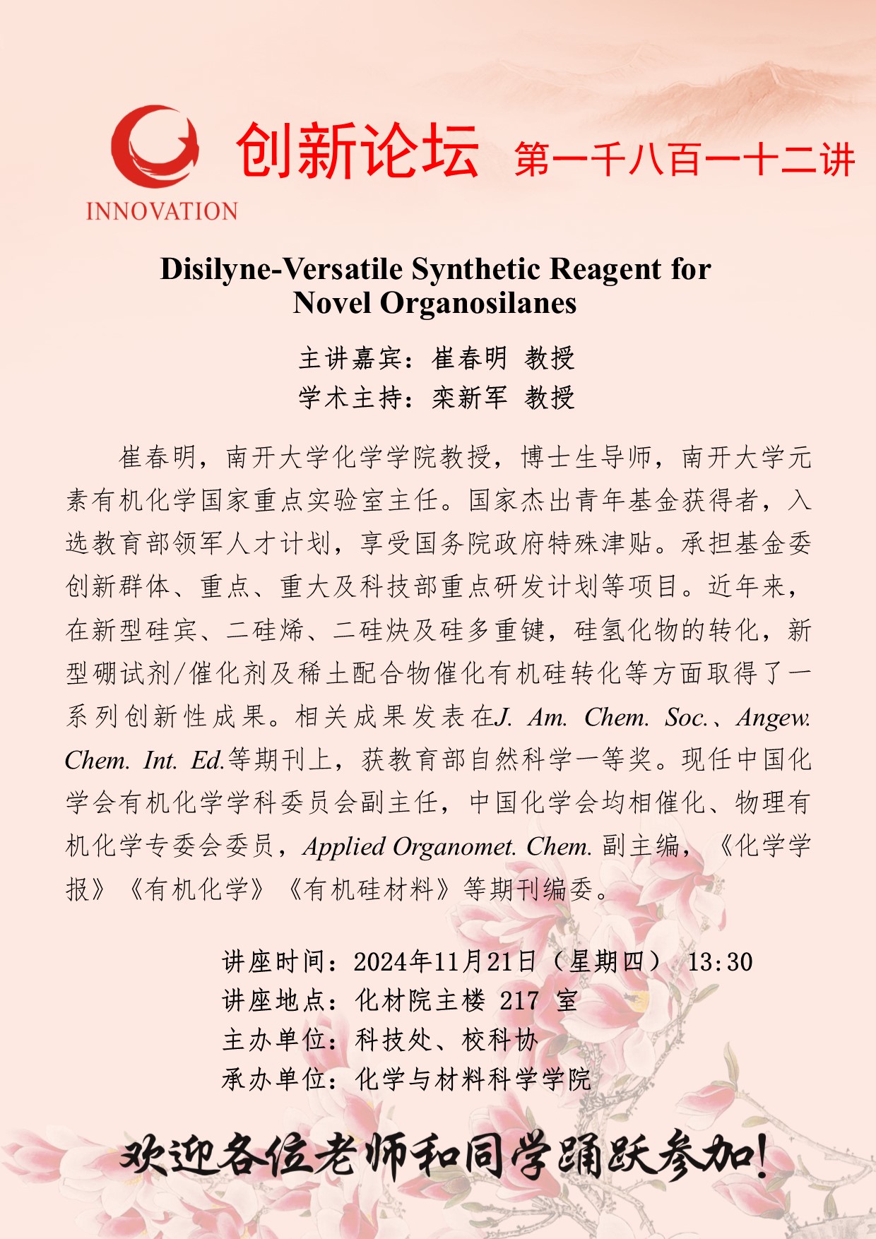 崔春明 教授 伟德国际1949始于英国创新论坛第一千八百一十二讲:Disilyne-Versatile Synthetic Reagent for 讲座时间 2024年11月21日(星期四) 13:30 讲座地点 化材院主楼 217 室 讲座人介绍 崔春明 教授 讲座内容