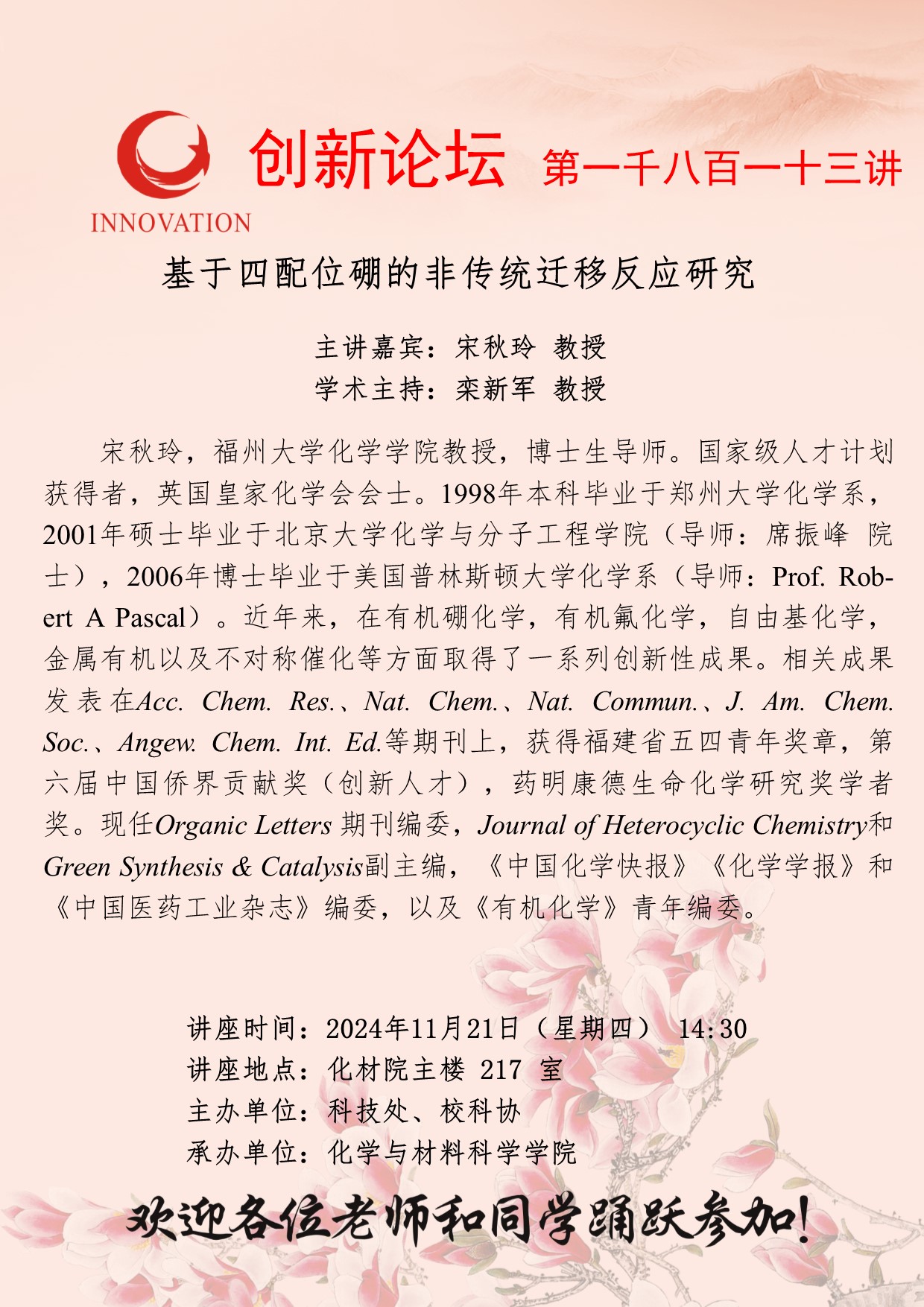 宋秋玲 教授 伟德国际1949始于英国创新论坛第一千八百一十三讲:基于四配位硼的非传统迁移反应研究 讲座时间 2024年11月21日(星期四) 14:30 讲座地点 化材院主楼 217 室 讲座人介绍 宋秋玲 教授 讲座内容