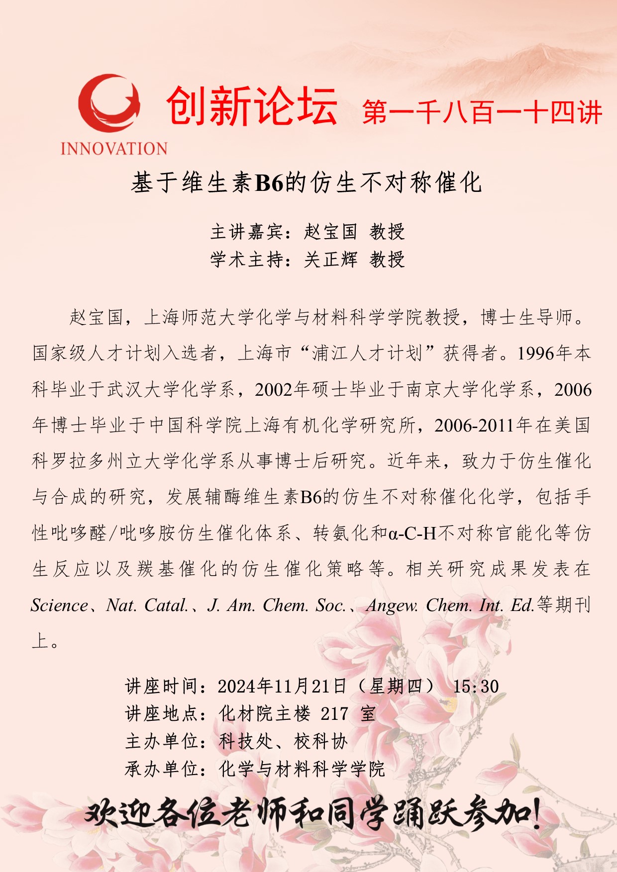 赵宝国 教授 伟德国际1949始于英国创新论坛第一千八百一十四讲:基于维生素B6的仿生不对称催化 讲座时间 2024年11月21日(星期四) 15:30 讲座地点 化材院主楼 217 室 讲座人介绍 赵宝国 教授 讲座内容