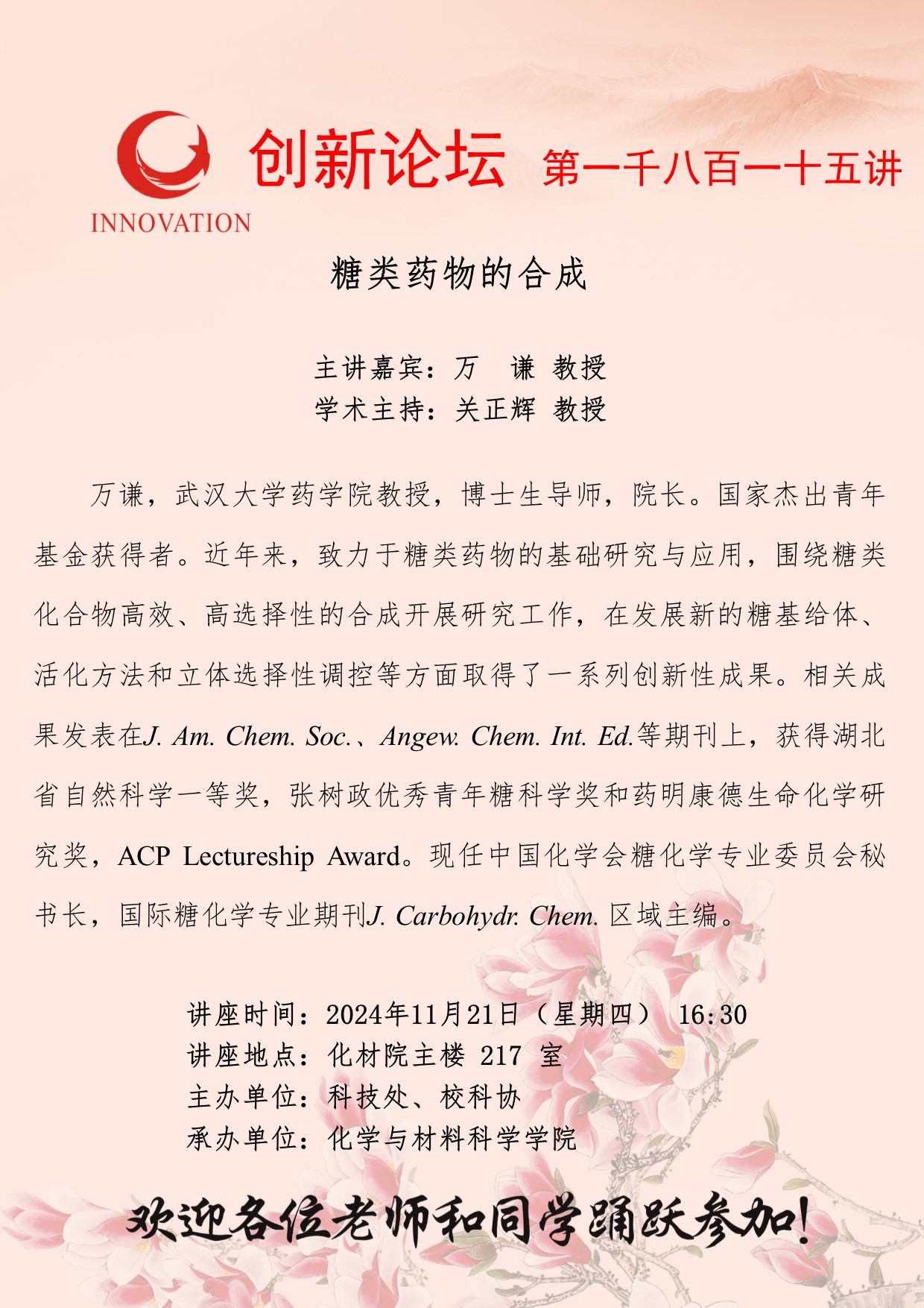 万谦 教授 伟德国际1949始于英国创新论坛第一千八百一十五讲:糖类药物的合成 讲座时间 2024年11月21日(星期四) 16:30 讲座地点 化材院主楼 217 室 讲座人介绍 万谦 教授 讲座内容