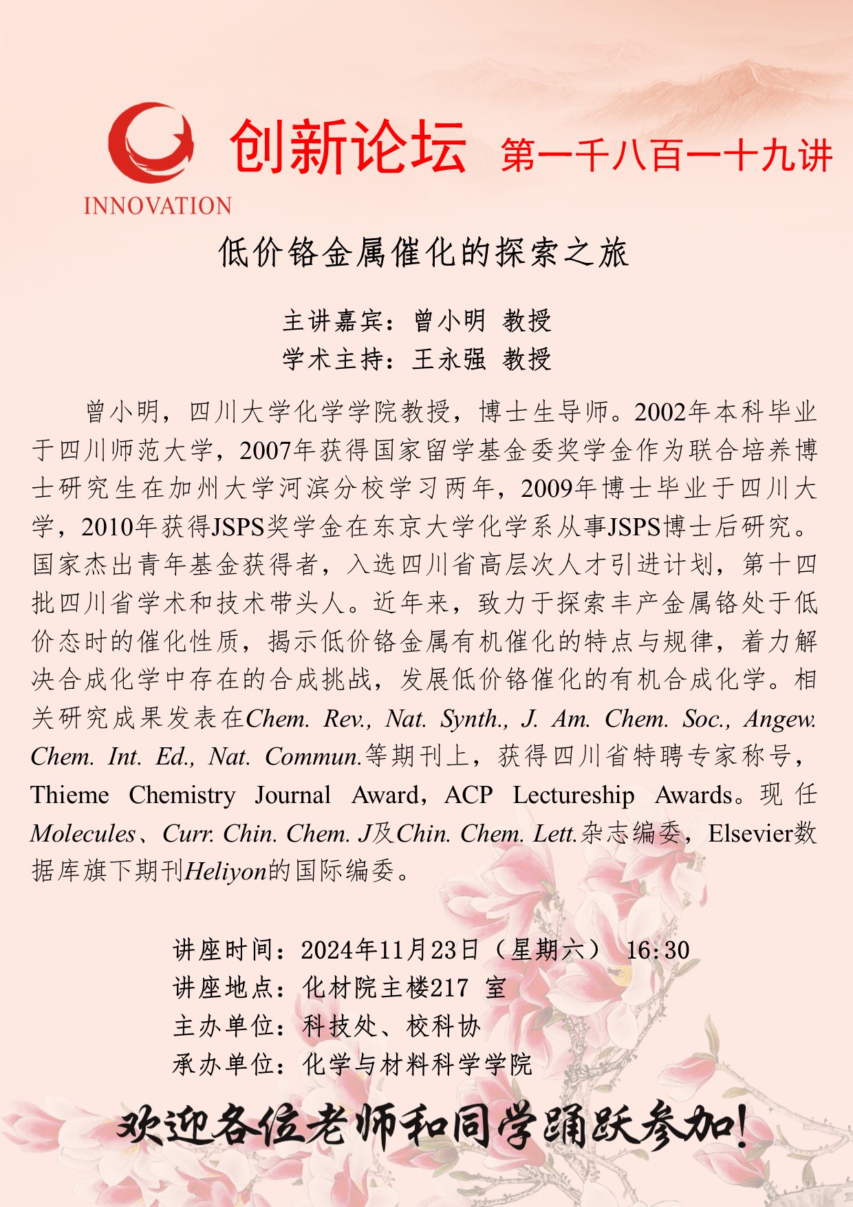 曾小明 教授 伟德国际1949始于英国创新论坛第一千八百一十九讲:低价铬金属催化的探索之旅 讲座时间 2024年11月23日(星期六) 16:30 讲座地点 化材院主楼217 室 讲座人介绍 曾小明 教授 讲座内容