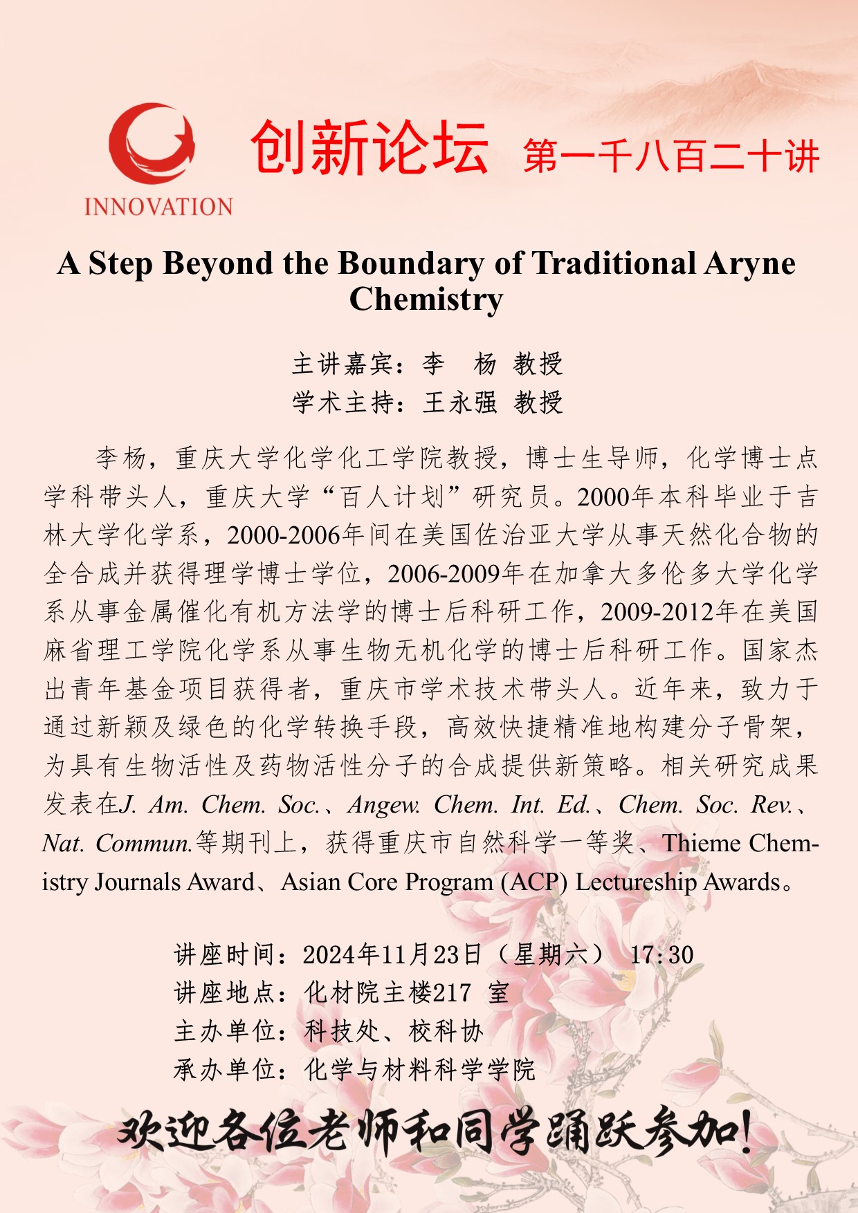 李杨 教授 伟德国际1949始于英国创新论坛第一千八百二十讲:A Step Beyond the Boundary of Traditional Aryne Chemistry 讲座时间 2024年11月23日(星期六) 17:30 讲座地点 化材院主楼217室 讲座人介绍 李杨 教授 讲座内容