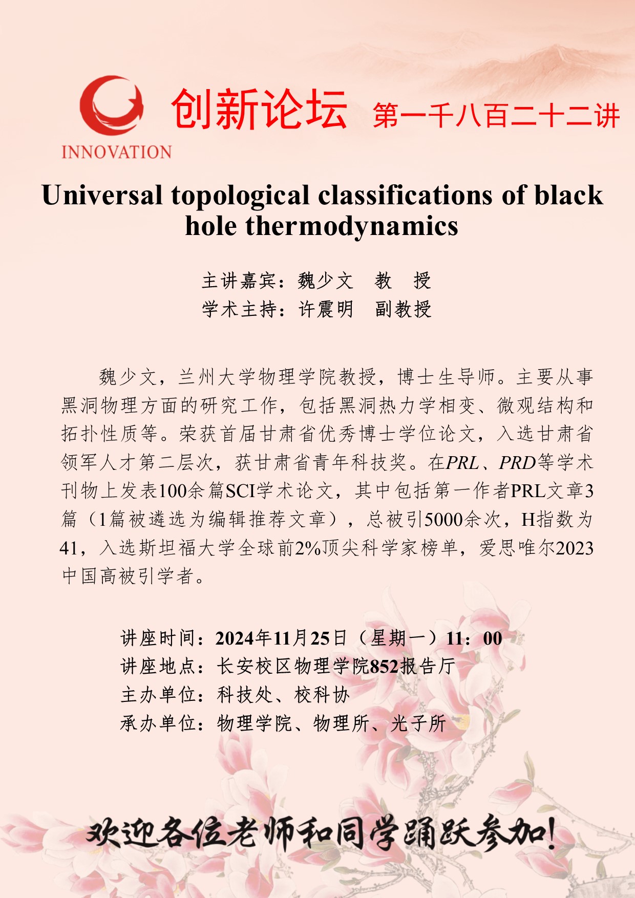 魏少文 教授 伟德国际1949始于英国创新论坛第一千八百二十二讲:Universal topological classifications of black hole thermodynamics 讲座时间 2024年11月25日(星期一)11:00 讲座地点 长安校区物理学院852报告厅 讲座人介绍 魏少文 教授 讲座内容