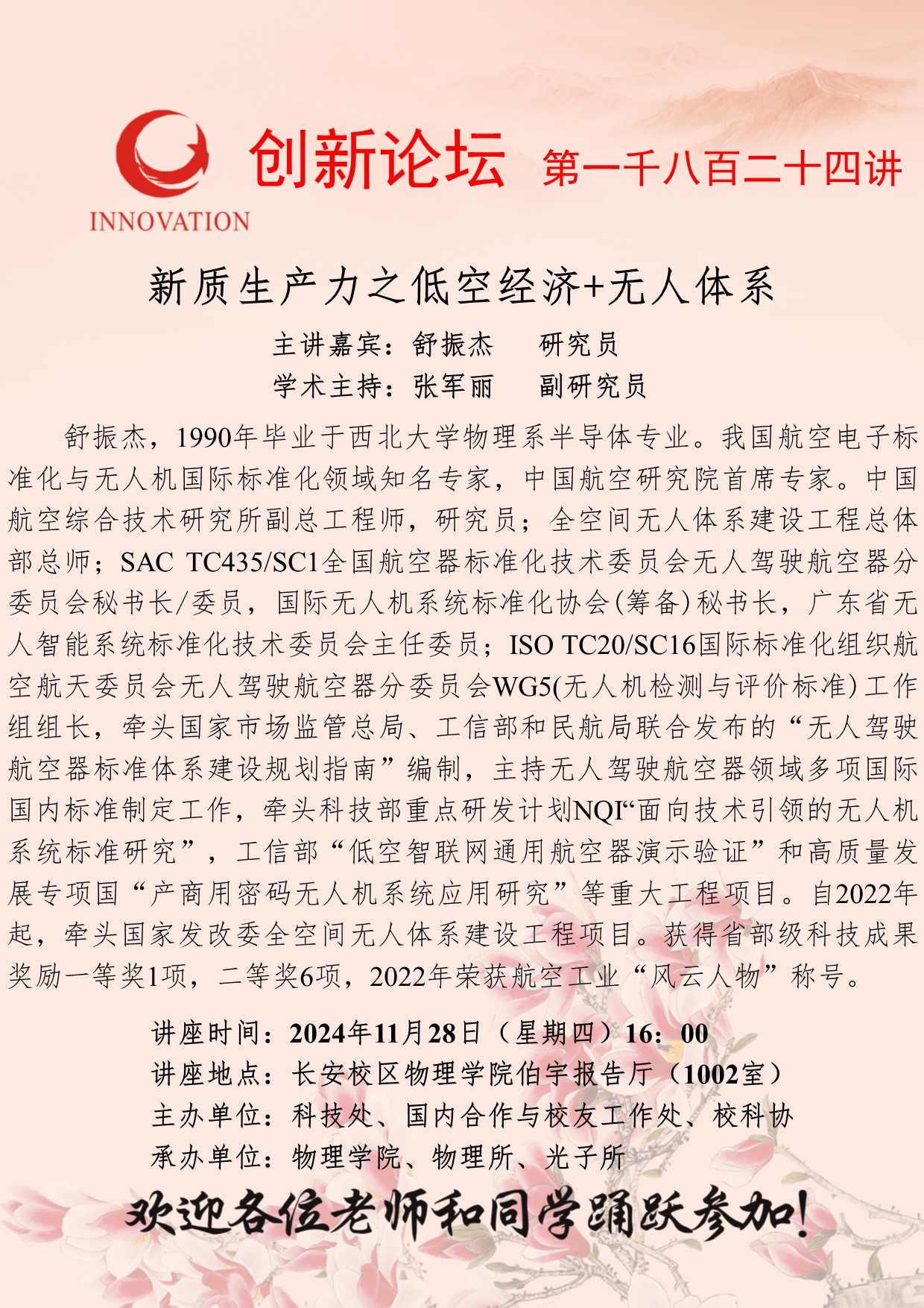 舒振杰 研究员 伟德国际1949始于英国创新论坛第一千八百二十四讲:新质生产力之低空经济+无人体系 讲座时间 2024年11月28日(星期四)16:00 讲座地点 长安校区物理学院伯宇报告厅(1002室) 讲座人介绍 舒振杰 研究员 讲座内容
