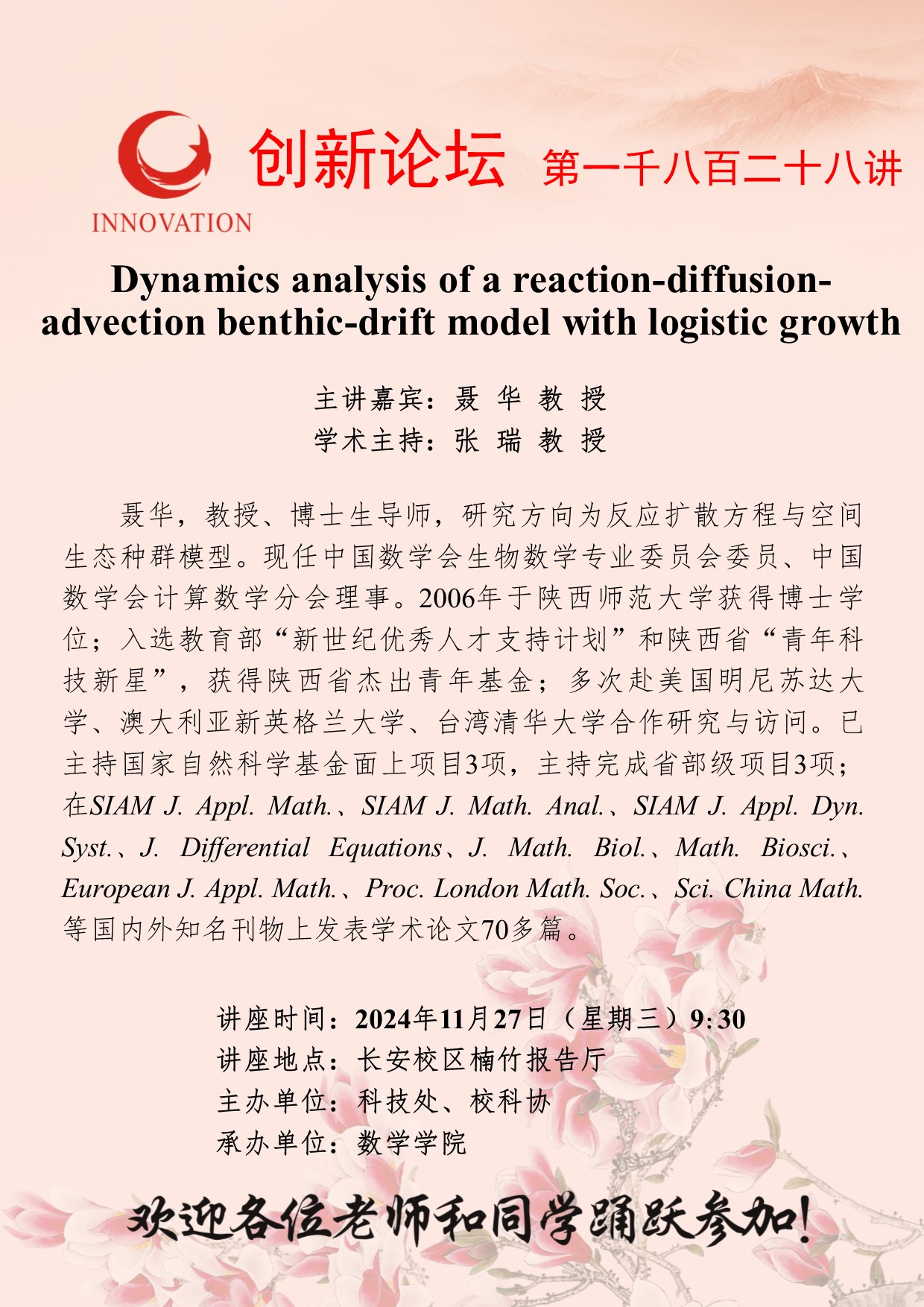 聂华 教授 伟德国际1949始于英国创新论坛第一千八百二十八讲:Dynamics analysis of a reaction-diffusion-advection benthic-drift model with logistic growth 讲座时间 2024年11月27日(星期三)9:30 讲座地点 长安校区楠竹报告厅 讲座人介绍 聂华 教授 讲座内容
