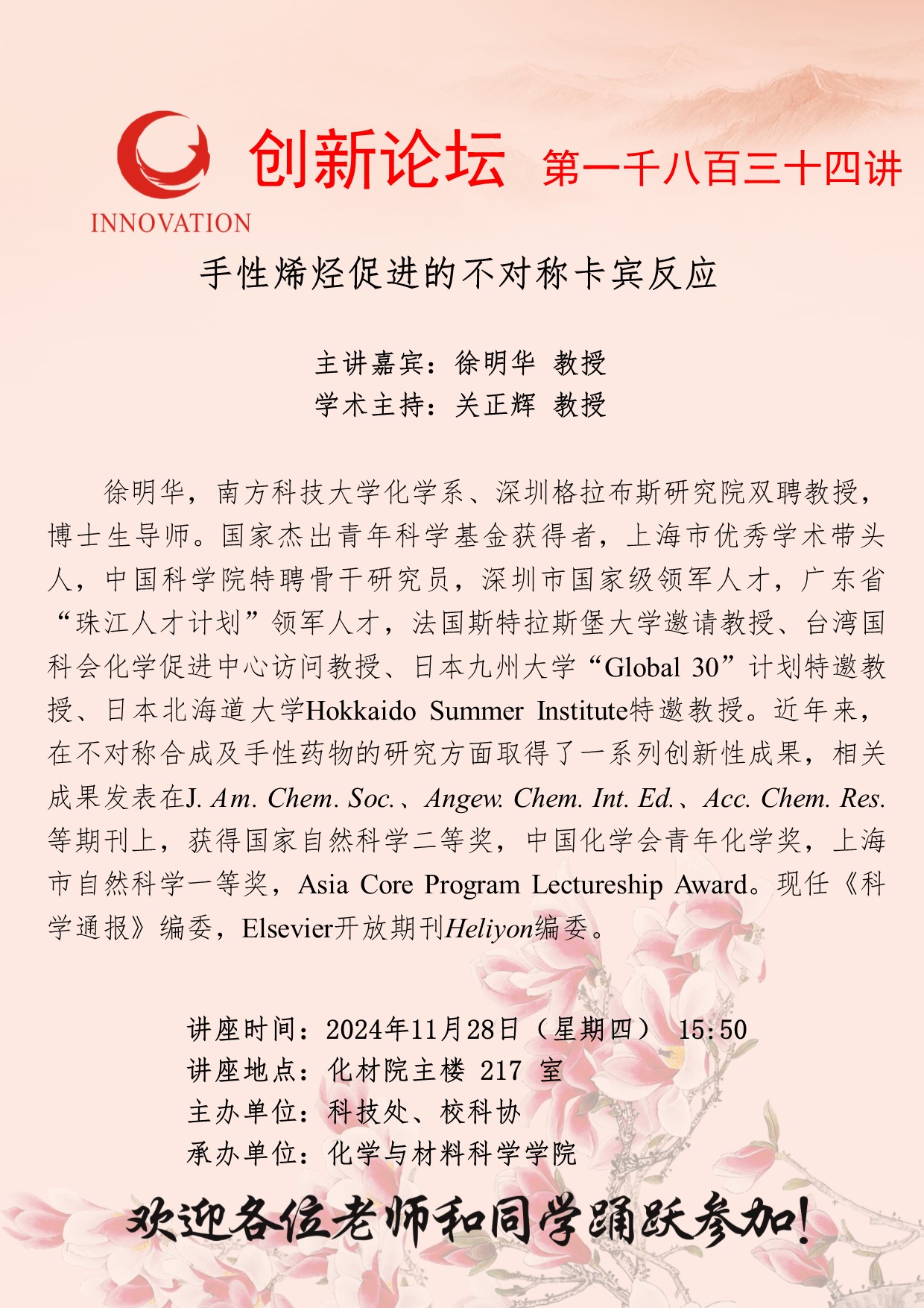 徐明华 教授 伟德国际1949始于英国创新论坛第一千八百三十四讲:手性烯烃促进的不对称卡宾反应 讲座时间 2024年11月28日(星期四) 15:50 讲座地点 化材院主楼217室 讲座人介绍 徐明华 教授 讲座内容