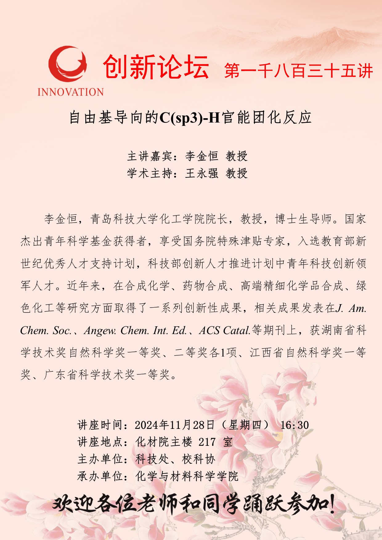李金恒 教授 伟德国际1949始于英国创新论坛第一千八百三十五讲:自由基导向的C(sp3)-H官能团化反应 讲座时间 2024年11月28日(星期四) 16:30 讲座地点 化材院主楼217室 讲座人介绍 李金恒 教授 讲座内容
