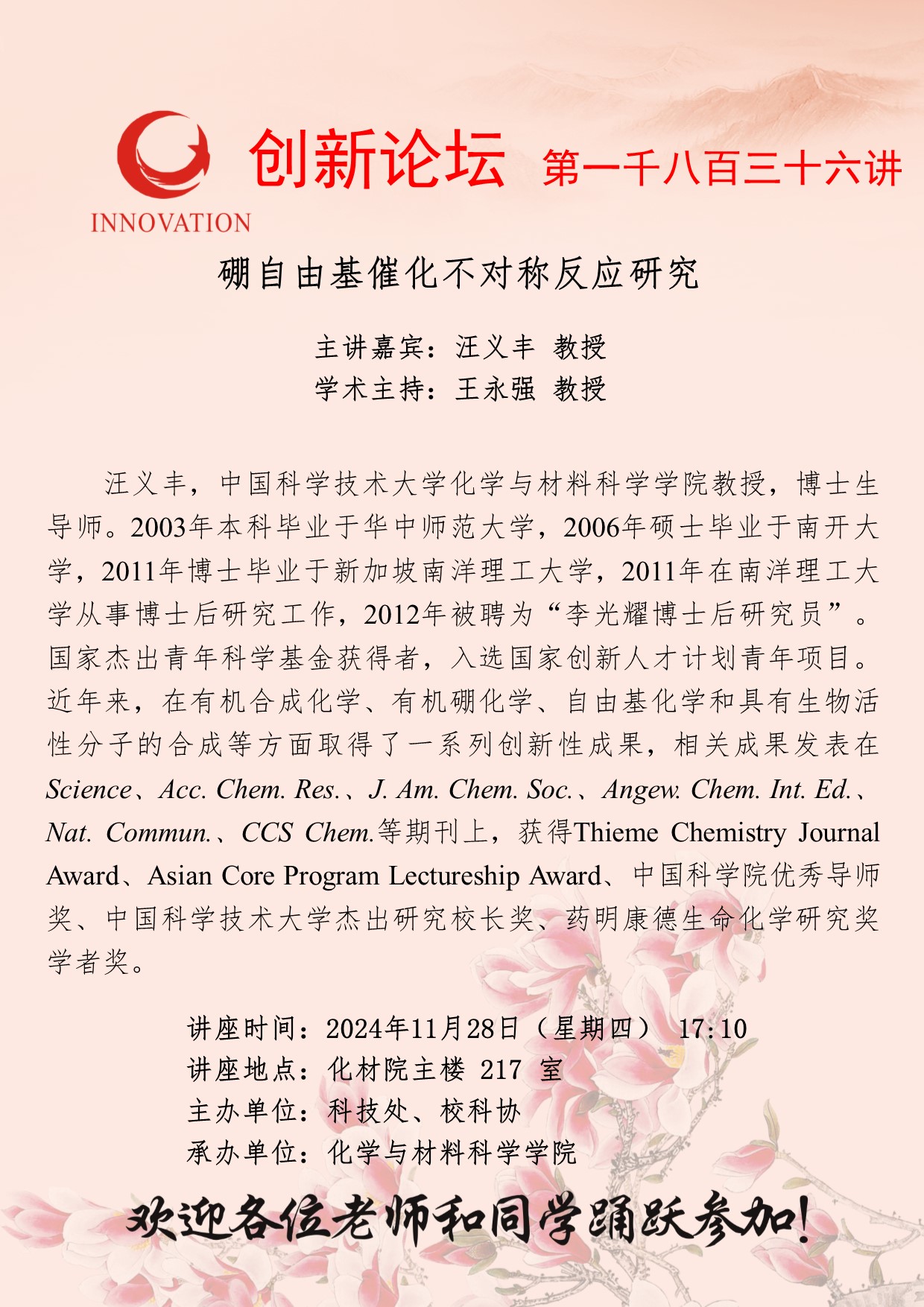 汪义丰 教授 伟德国际1949始于英国创新论坛第一千八百三十六讲:硼自由基催化不对称反应研究 讲座时间 2024年11月28日(星期四) 17:10 讲座地点 化材院主楼217室 讲座人介绍 汪义丰 教授 讲座内容
