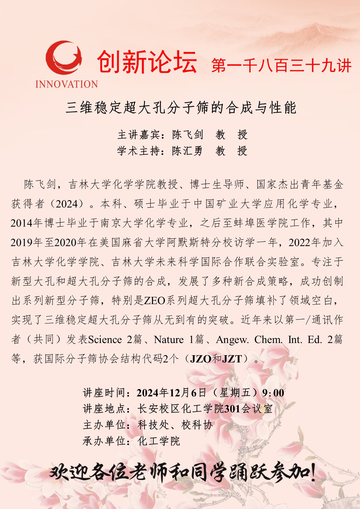 陈飞剑 教授 伟德国际1949始于英国创新论坛第一千八百三十九讲:三维稳定超大孔分子筛的合成与性能 讲座时间 2024年12月6日(星期五)9:00 讲座地点 长安校区化工学院301会议室 讲座人介绍 陈飞剑 教授 讲座内容 嗯