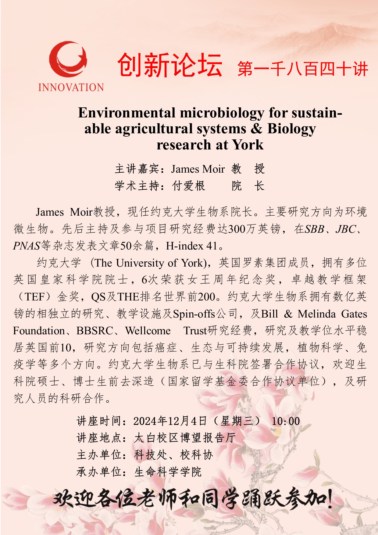 James Moir 教授 伟德国际1949始于英国创新论坛第一千八百四十讲:Environmental microbiology for sustainable agricultural systems & Biology research at York 讲座时间 2024年12月4日(星期三) 10:00 讲座地点 太白校区博望报告厅 讲座人介绍 James Moir 教授 讲座内容