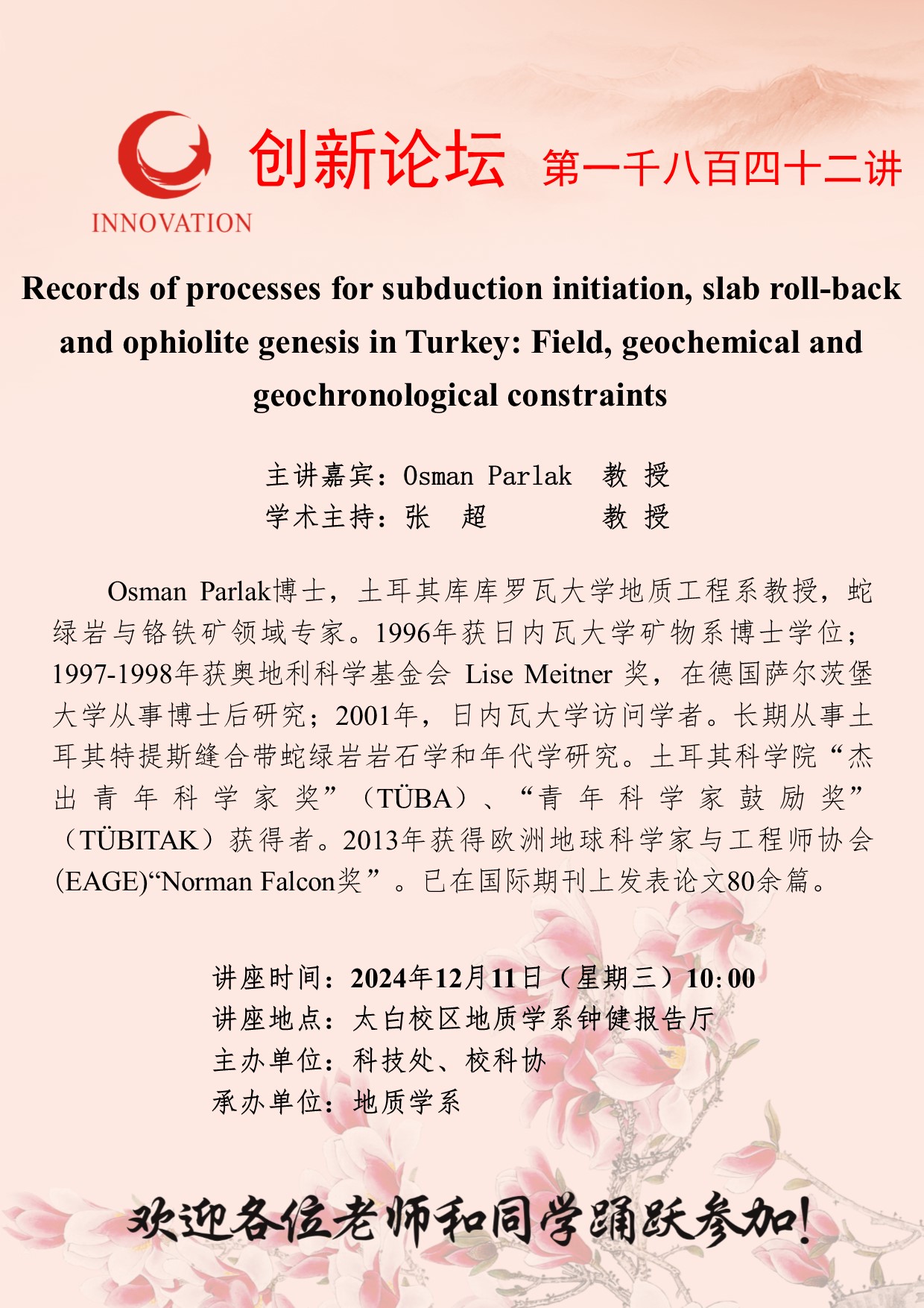 Osman Parlak 教授 伟德国际1949始于英国创新论坛第一千八百四十二讲:Records of processes for subduction initiation, slab roll-back and ophiolite genesis in Turkey: Field, geochemical and geochronological constraints 讲座时间 2024年12月11日(星期三)10:00 讲座地点 太白校区地质学系钟健报告厅 讲座人介绍 Osman Parlak 教授 讲座内容
