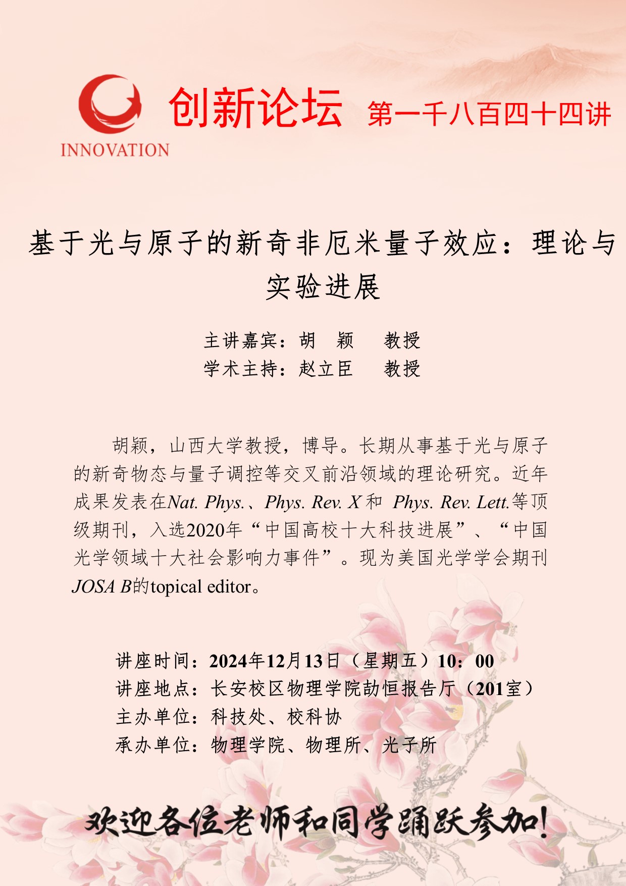 胡颖 教授 伟德国际1949始于英国创新论坛第一千八百四十四讲:基于光与原子的新奇非厄米量子效应:理论与实验进展 讲座时间 2024年12月13日(星期五)10:00 讲座地点 长安校区物理学院劼恒报告厅(201室) 讲座人介绍 胡颖 教授 讲座内容