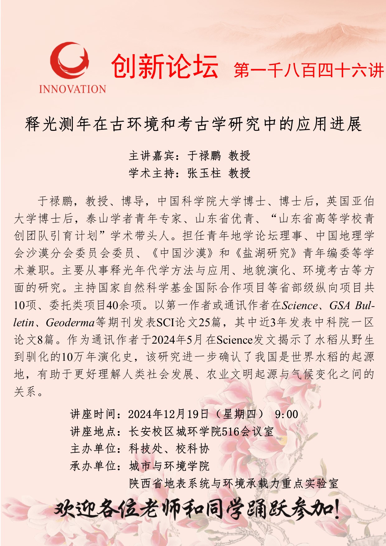 于禄鹏 教授 伟德国际1949始于英国创新论坛第一千八百四十六讲:释光测年在古环境和考古学研究中的应用进展 讲座时间 2024年12月19日(星期四) 9:00 讲座地点 长安校区城环学院516会议室 讲座人介绍 于禄鹏 教授 讲座内容