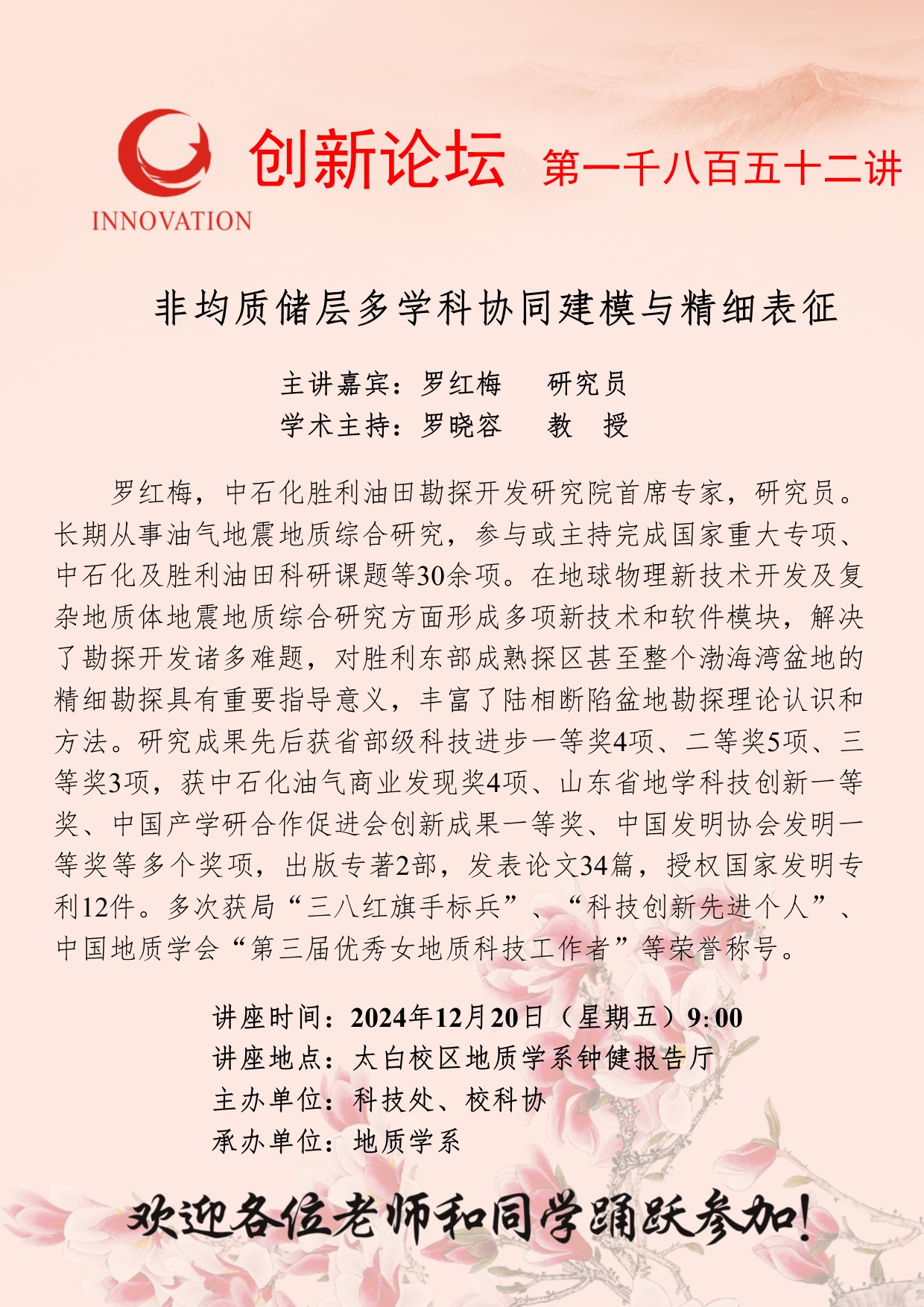 罗红梅 研究员 伟德国际1949始于英国创新论坛第一千八百五十二讲:非均质储层多学科协同建模与精细表征 讲座时间 2024年12月20日(星期五)9:00 讲座地点 太白校区地质学系钟健报告厅 讲座人介绍 罗红梅 研究员 讲座内容
