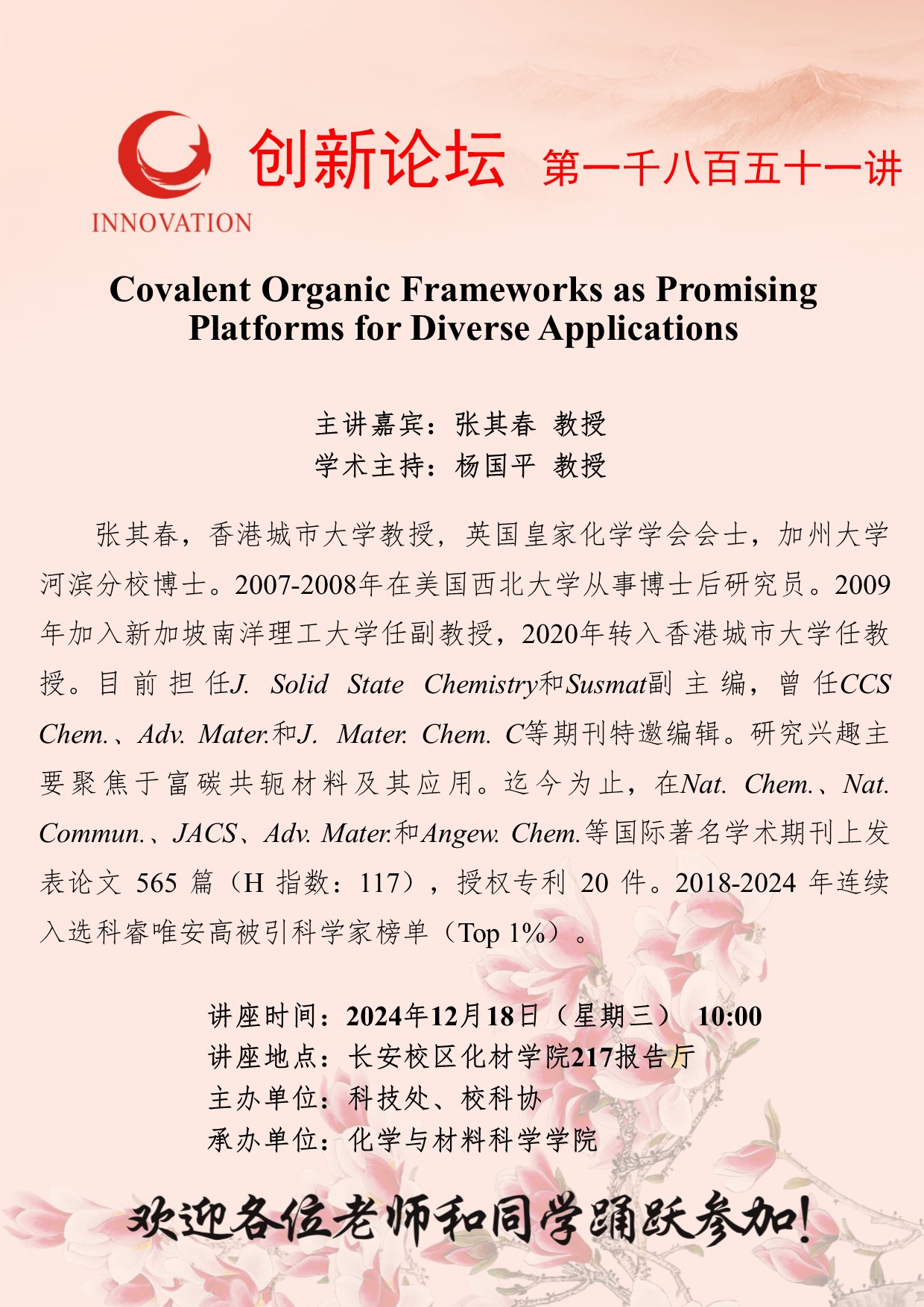 张其春 教授 伟德国际1949始于英国创新论坛第一千八百五十一讲:Covalent Organic Frameworks as Promising Platforms for Diverse Applications 讲座时间 2024年12月18日(星期三) 10:00 讲座地点 长安校区化材学院217报告厅 讲座人介绍 张其春 教授 讲座内容