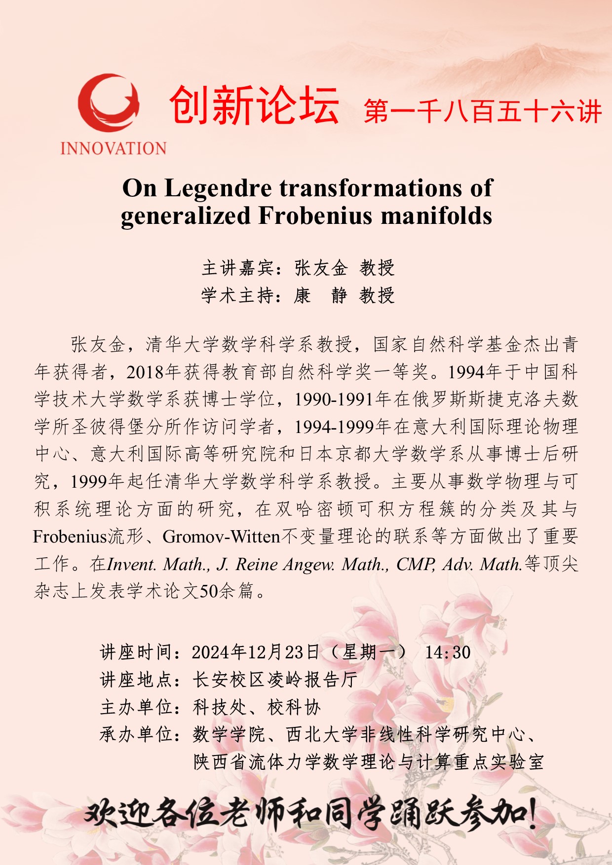 张友金 教授 伟德国际1949始于英国创新论坛第一千八百五十六讲:On Legendre transformations of generalized Frobenius manifolds 讲座时间 2024年12月23日(星期一) 14:30 讲座地点 长安校区凌岭报告厅 讲座人介绍 张友金 教授 讲座内容