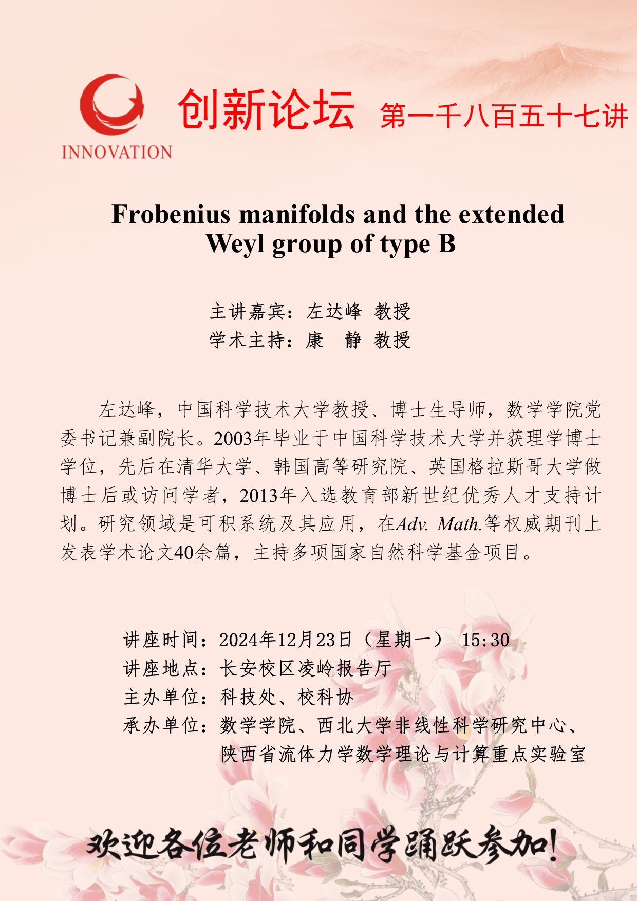 左达峰 教授 伟德国际1949始于英国创新论坛第一千八百五十七讲:Frobenius manifolds and the extended Weyl group of type B 讲座时间 2024年12月23日(星期一) 15:30 讲座地点 长安校区凌岭报告厅 讲座人介绍 左达峰 教授 讲座内容