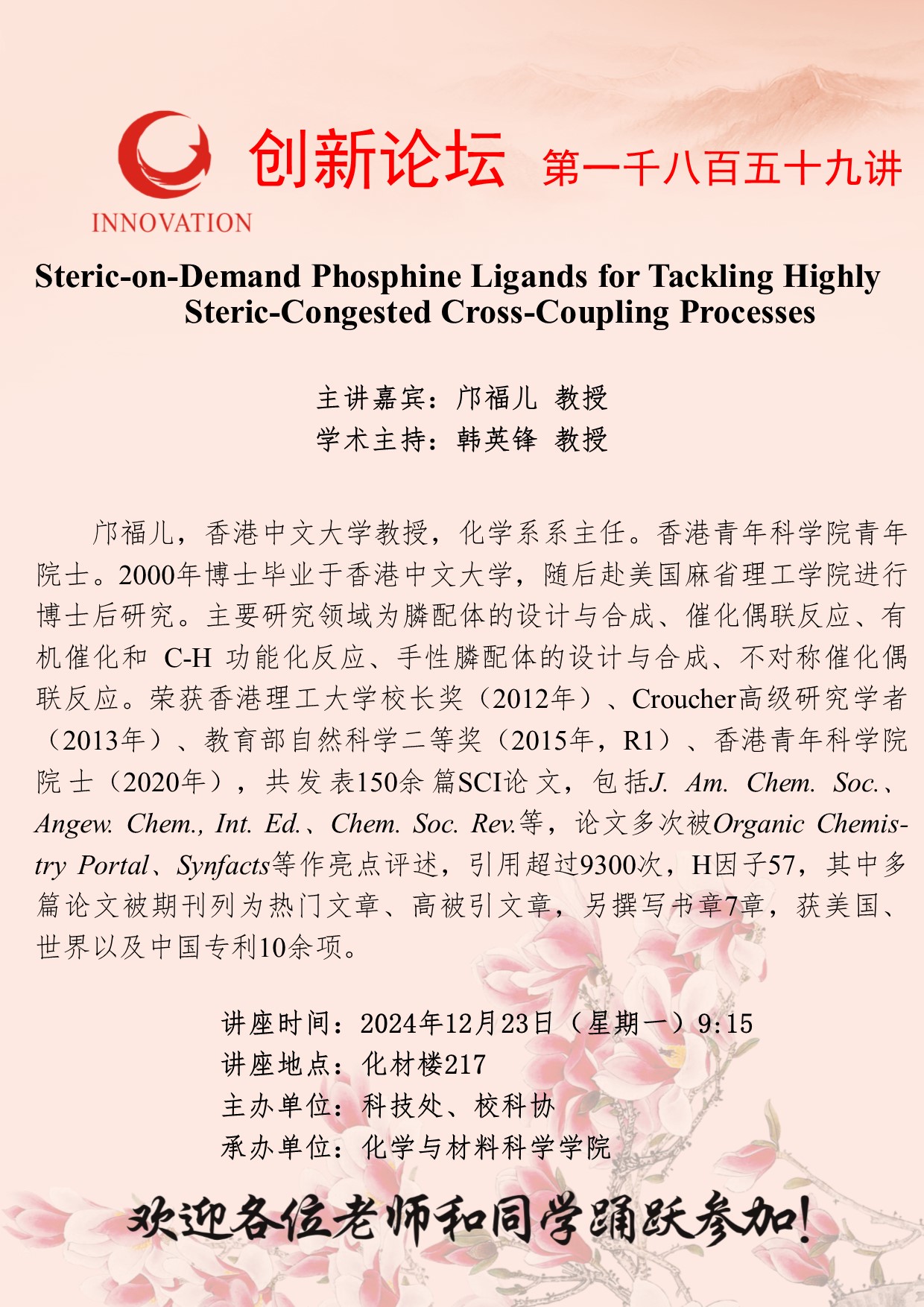 邝福儿 教授 伟德国际1949始于英国创新论坛第一千八百五十九讲:Steric-on-Demand Phosphine Ligands for Tackling Highly Steric-Congested Cross-Coupling Processes 讲座时间 2024年12月23日(星期一)9:15 讲座地点 化材楼217 讲座人介绍 邝福儿 教授 讲座内容