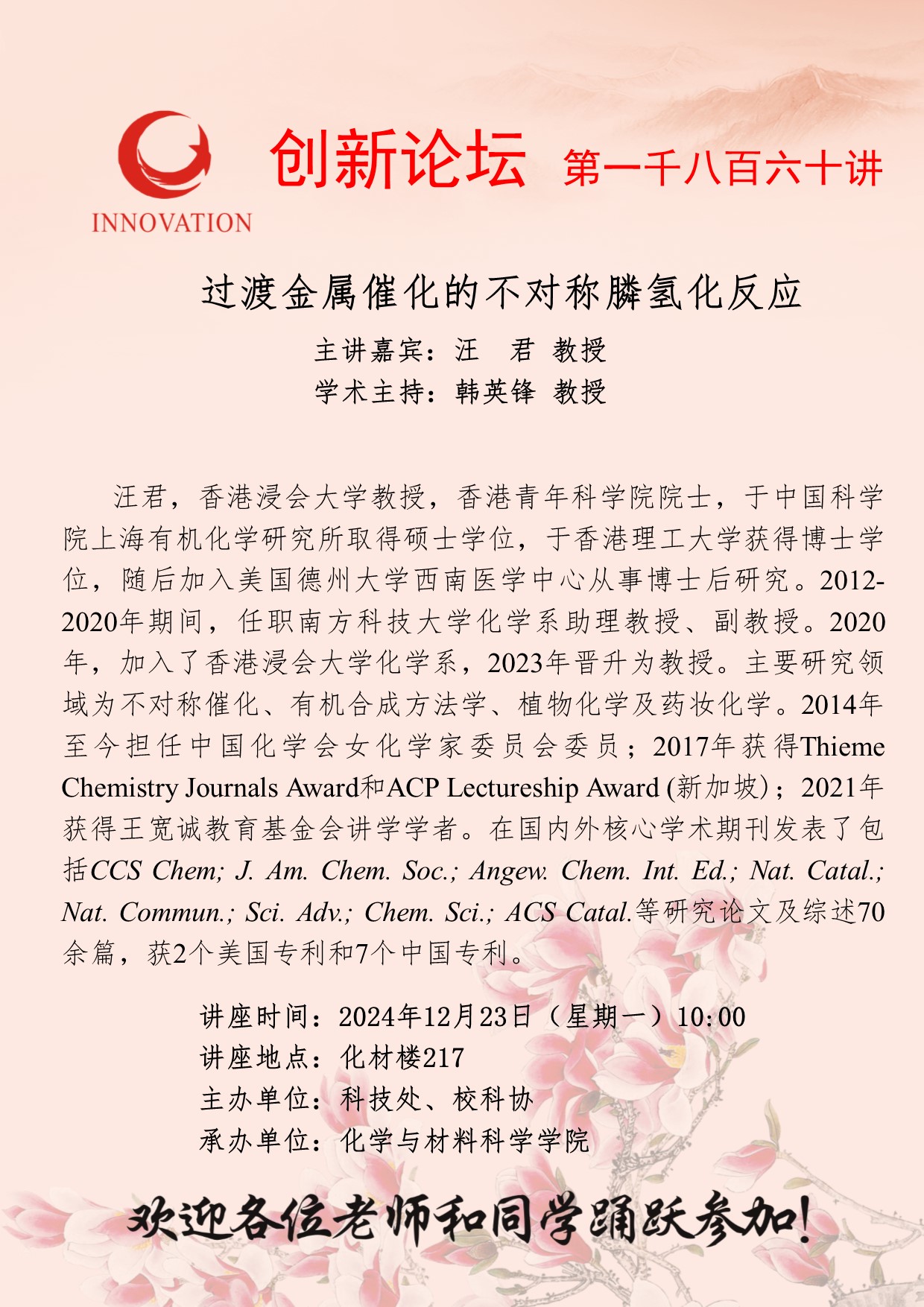 汪君 教授 伟德国际1949始于英国创新论坛第一千八百六十讲:过渡金属催化的不对称膦氢化反应 讲座时间 2024年12月23日(星期一)10:00 讲座地点 化材楼217 讲座人介绍 汪君 教授 讲座内容