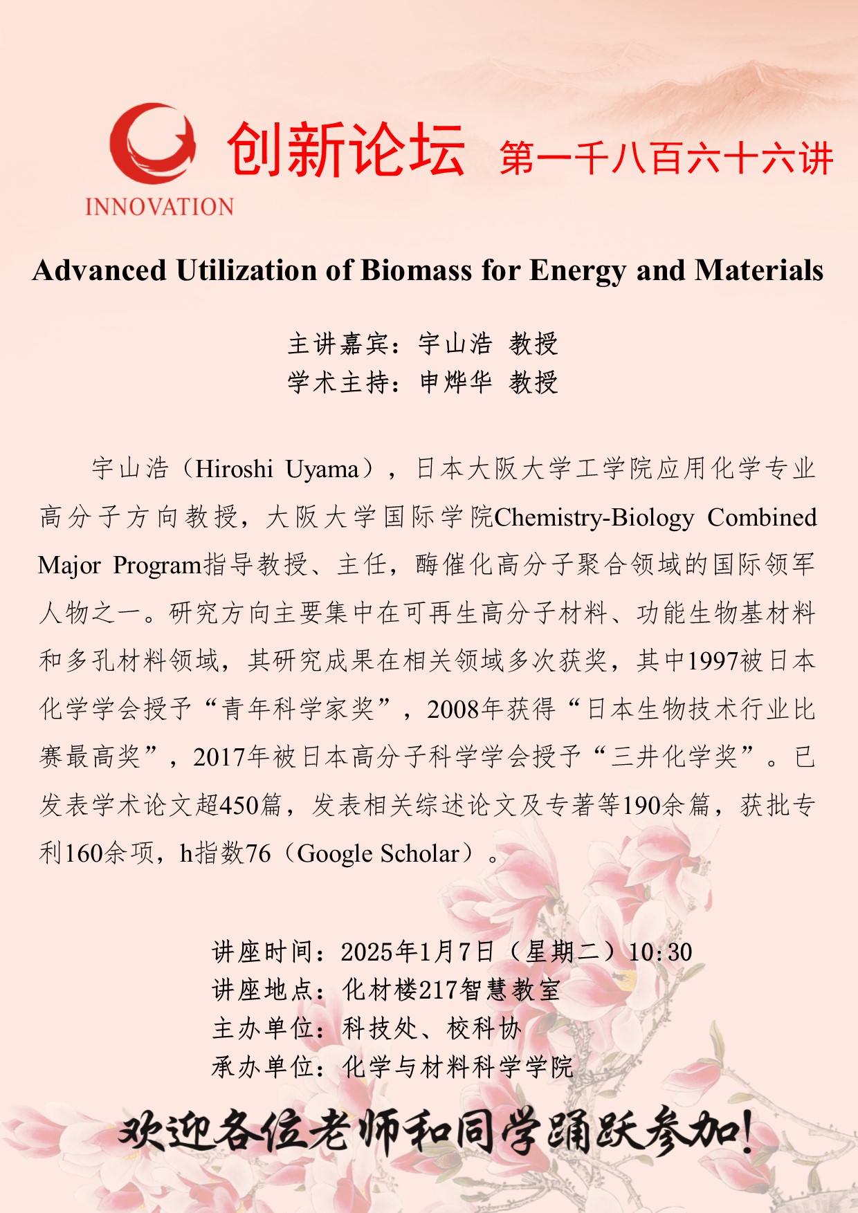 宇山浩 教授 伟德国际1949始于英国创新论坛第一千八百六十六讲:Advanced Utilization of Biomass for Energy and Materials 讲座时间 2025年1月7日(星期二)10:30 讲座地点 化材楼217智慧教室 讲座人介绍 宇山浩 教授 讲座内容