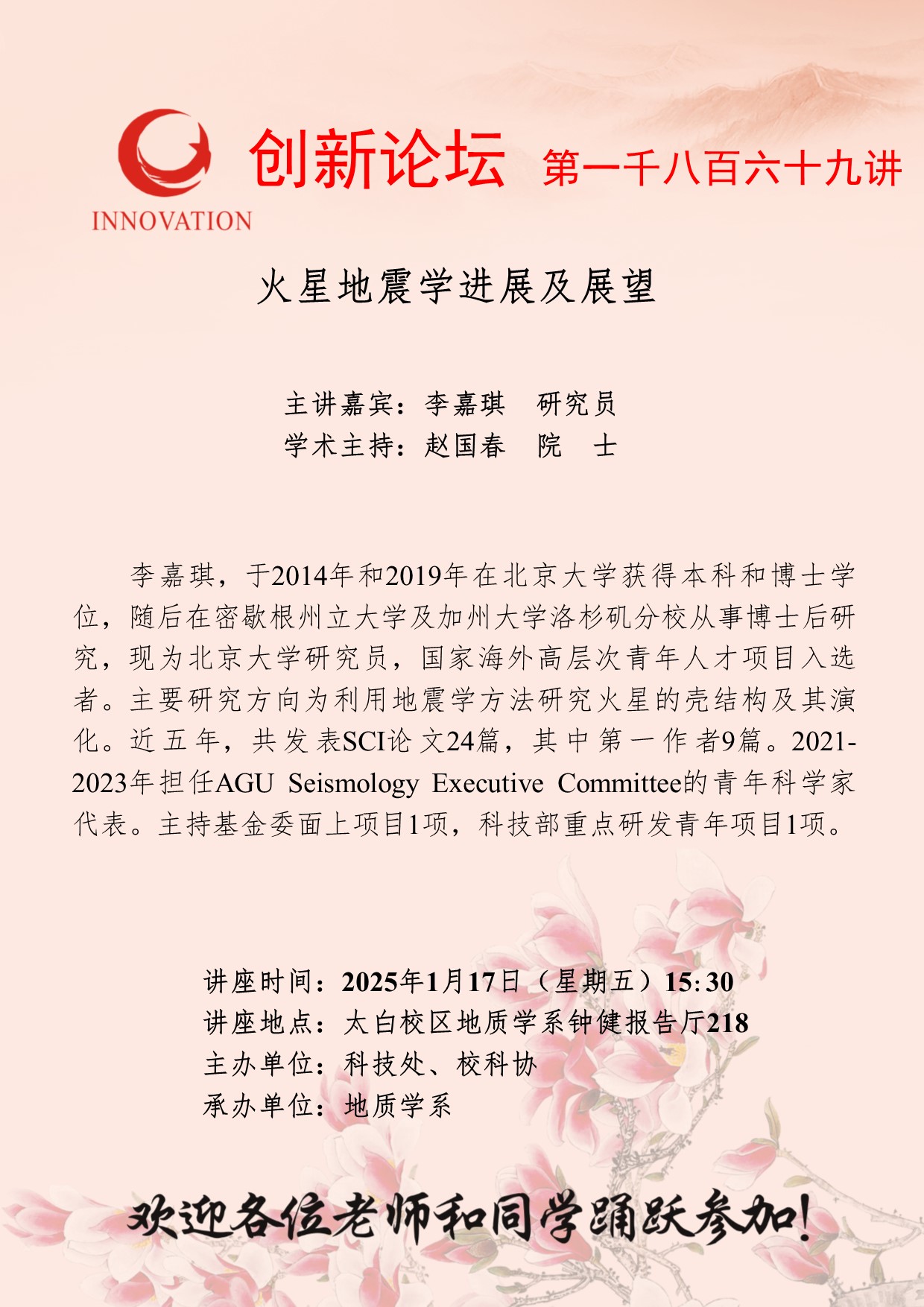 李嘉琪 研究员 伟德国际1949始于英国创新论坛第一千八百六十九讲:火星地震学进展及展望 讲座时间 2025年1月17日(星期五)15:30 讲座地点 太白校区地质学系钟健报告厅218 讲座人介绍 李嘉琪 研究员 讲座内容